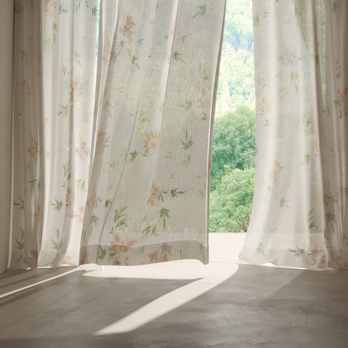 Tanz dich mit LOVELY durch die Blumenwiese. Das Biophilie-inspirierte Design verstreut florale Elemente über einen weißen Fond. Ein klassisches Aquarell, modern interpretiert. Naturbetonte Farben wie Apricot Rose, Zartgelb und Veilchenblau definieren den sanften Blumendruck. Lovely Highlight: Der locker gewebte, zeitgenössische Webstreifen des Druckfonds (Artikel SUMMER aus F23) erzeugt im Gegenlicht romantische Lichtspiele.