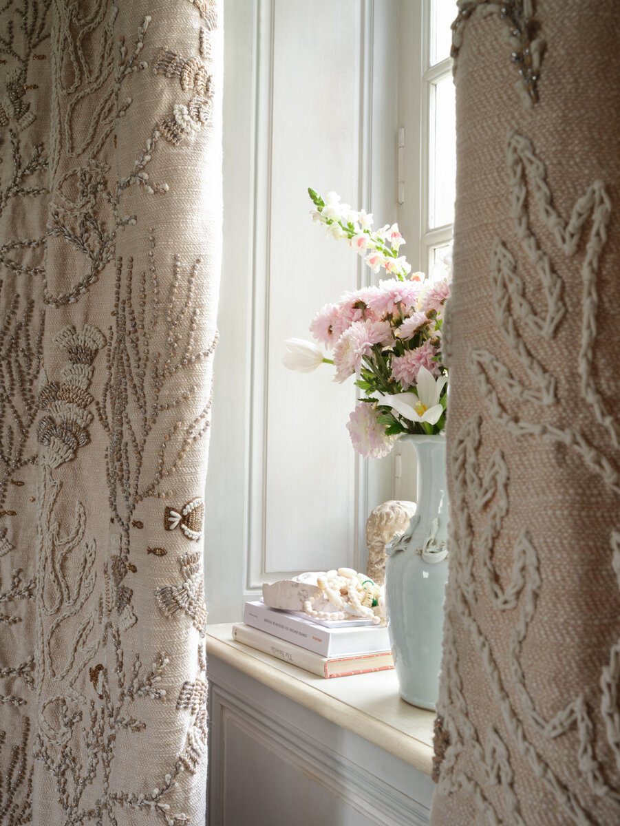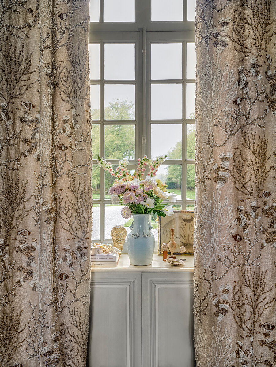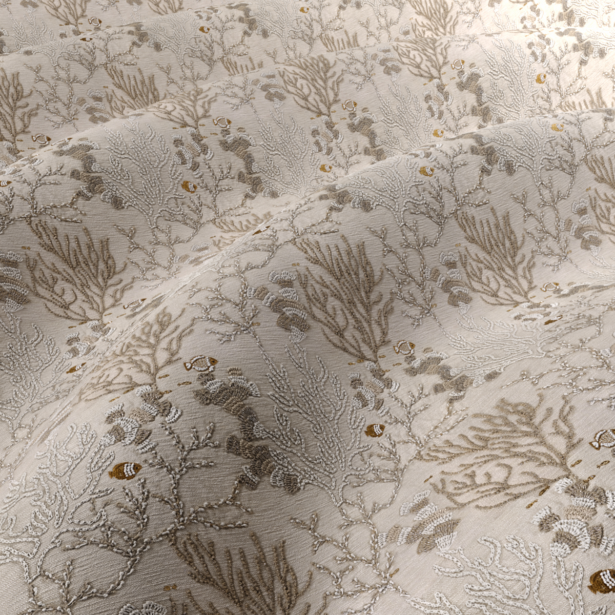 ANTIGUA ist ein handwerkliches Meisterwerk. Die karibisch-inspirierten Motive entführen uns in eine kunstvolle Unterwasserwelt inmitten metallisch schimmernder Korallen und Fische, deren Details liebevoll mit Perlenapplikationen akzentuiert sind. Hier formieren sich kreative Schaffenskraft und Kunstfertigkeit zu einem der Highlights der Kollektion. Jedes einzelne Motiv wurde in einer anderen Sticktechnik von Hand auf den natürlich strukturierten Fond gestickt.
