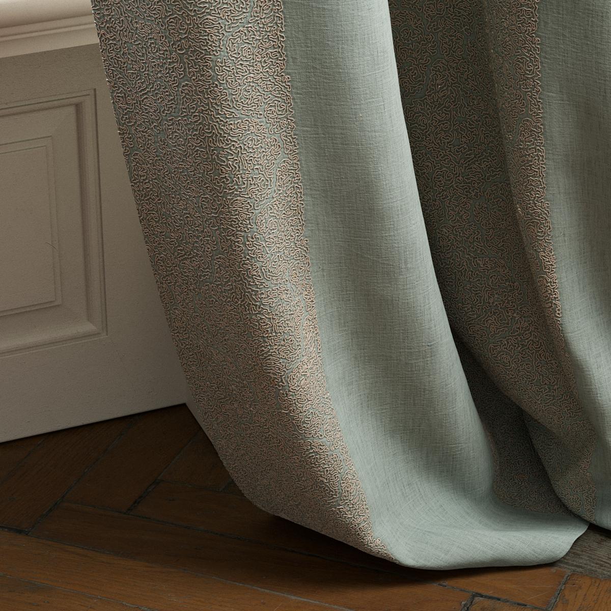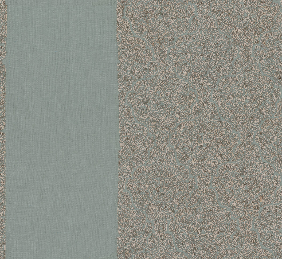 Die raffinierte Ton-in-Ton-Stickerei verschmilzt sanft mit dem schimmernden Fond und erzeugt eine subtile, reliefartige Textur. Das Spiel aus mattem Leinen und feiner Stickerei verleiht dem Stoff eine elegante Leichtigkeit und zeitlose Anmut.