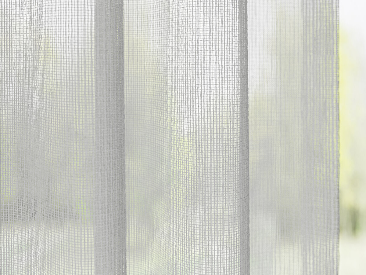 Der raumhohe Transparentstoff erinnert an ein zartes Korbgeflecht. Die reizvolle Kombination aus groben und feinen Garnen verleiht dem Gewebe eine besondere Textur und Tiefe. Die feinen Nuancen der natürlichen Farbpalette fügen sich perfekt in jede Umgebung ein und tauchen den Raum in ein angenehm weiches Licht.