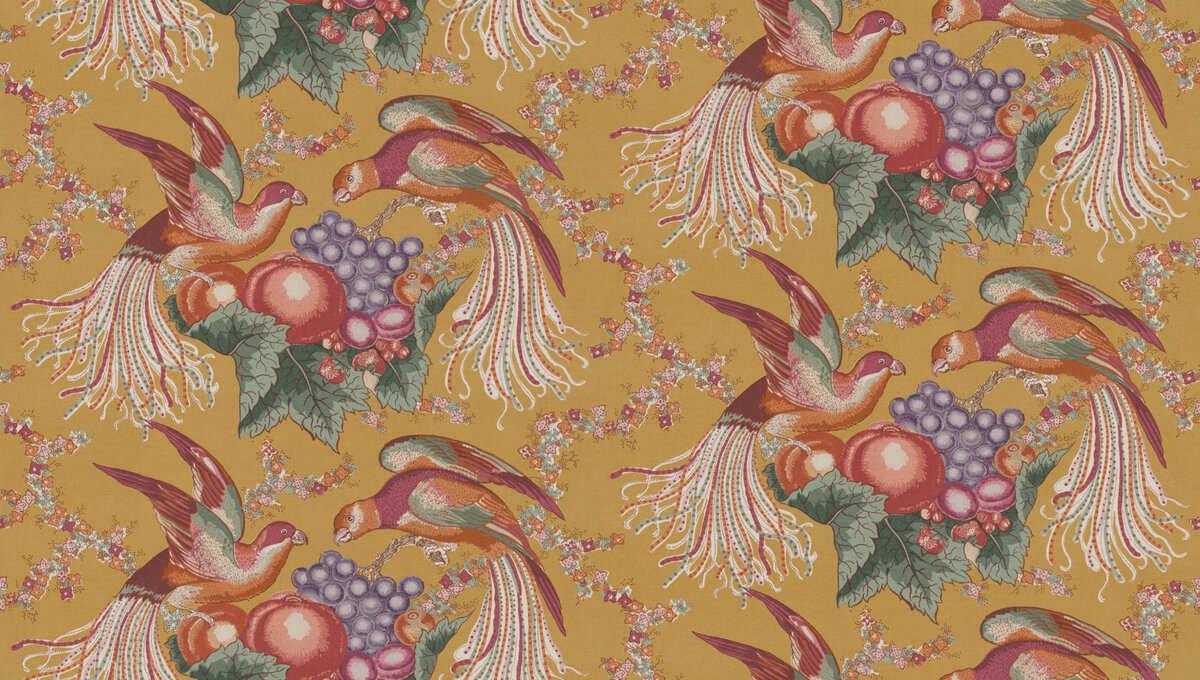Belvedere ist ein charaktervoller Print mit luxuriösem Chintz-Finish, der den Zauber Antiguas widerspiegelt. Das Archiv-Design, dessen Name „schöne Aussicht" bedeutet, präsentiert sich als Neuauflage in zarten Farben. Belvedere bietet das perfekte Gleichgewicht aus Verspieltheit und Funktionalität. Das Motiv zeigt zwei verspielte Papageien, die Obst aus einer Schale stibitzen, und ist in vier Koloriten erhältlich: rostige neutrale Töne mit tiefem Dunkelgrau, klassische Blautöne und Weiß, intensives Safrangelb mit satten Rosanuancen und sanfte Blautöne mit lebhaftem Grün und Gold.
