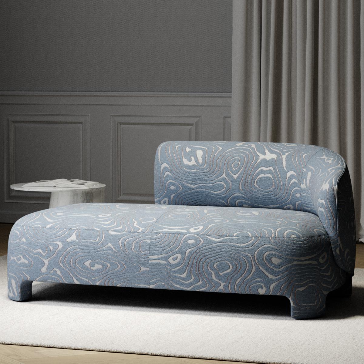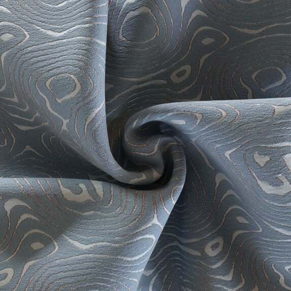 Der dekorative Bezugsstoff entfaltet seine Wirkung in einer feinen Balance aus Bewegung und Ruhe. Das marmorierte Jacquardgewebe zeigt ein Ton-in-Ton-Muster, dessen Linien wie Wasserströmungen über die Fläche gleiten. Im Wechselspiel von voluminösem Bouclé-Garn und mattem Satingrund entsteht eine subtile Reliefstruktur, die die gewebte Oberfläche sanft modelliert. Feine Konturlinien betonen die moirierende Maserung des Motivs und lassen das visuelle Relief klar hervortreten.