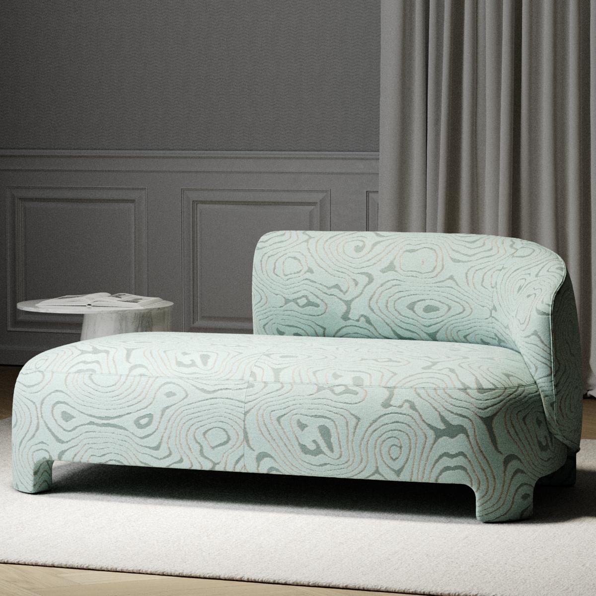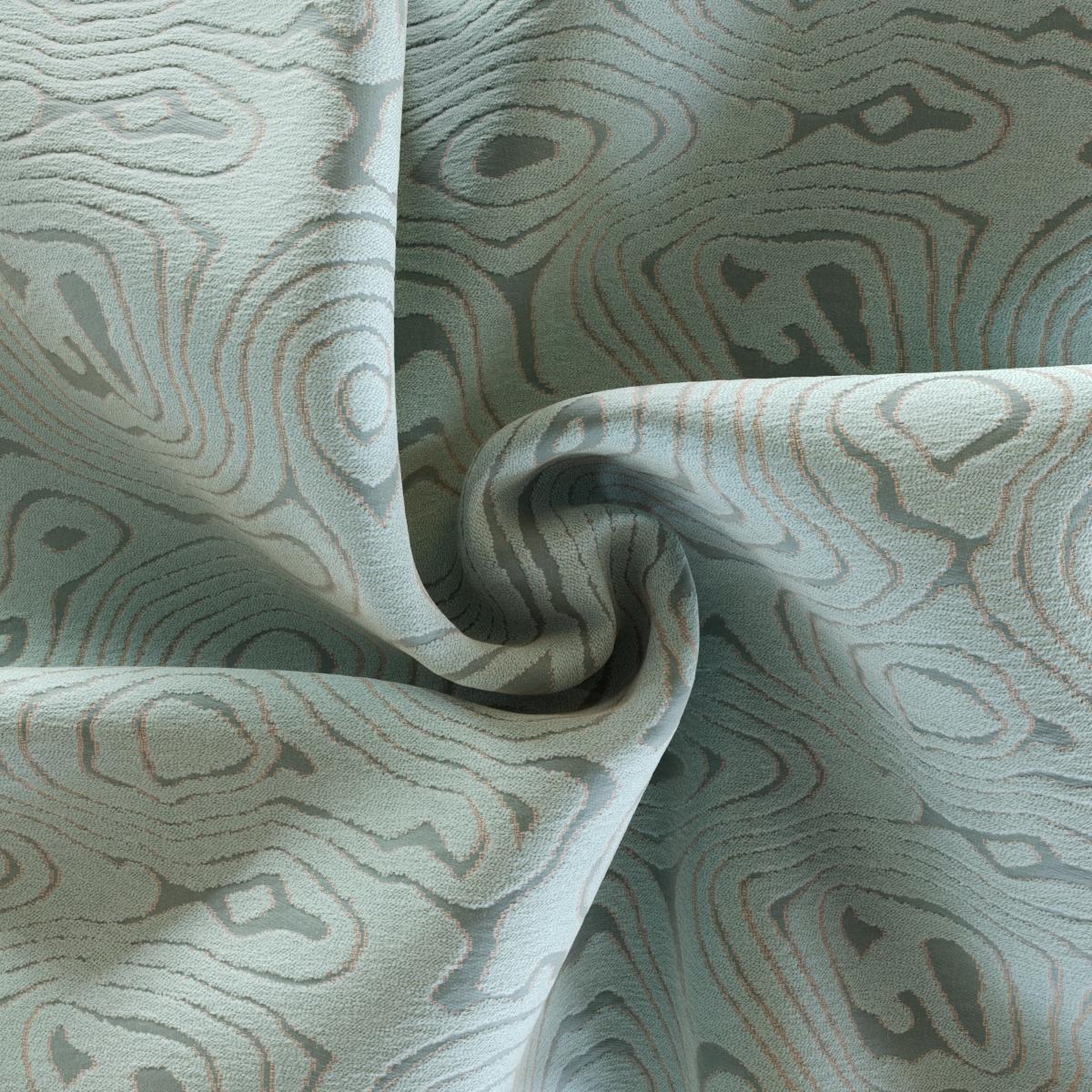 Der dekorative Bezugsstoff entfaltet seine Wirkung in einer feinen Balance aus Bewegung und Ruhe. Das marmorierte Jacquardgewebe zeigt ein Ton-in-Ton-Muster, dessen Linien wie Wasserströmungen über die Fläche gleiten. Im Wechselspiel von voluminösem Bouclé-Garn und mattem Satingrund entsteht eine subtile Reliefstruktur, die die gewebte Oberfläche sanft modelliert. Feine Konturlinien betonen die moirierende Maserung des Motivs und lassen das visuelle Relief klar hervortreten.