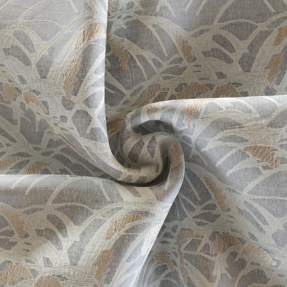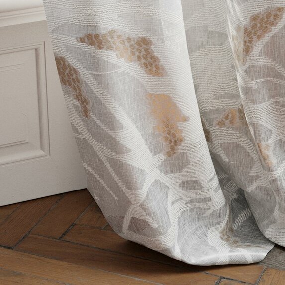 Das großzügig angelegte Scherli-Design rankt sich in sanften Bewegungen über den transparenten Fond – ein Geflecht aus Blättern, Zweigen und traubenförmigen Blüten, die im Gegenlicht ihre ganze Faszination entfalten. Die raffinierte Balance zwischen dichten und durchscheinenden Partien lässt ein feines Wechselspiel von Licht und Schatten entstehen, das dem Raum eine poetische Atmosphäre verleiht. Metallisch schimmernde Akzente innerhalb der Blüten setzen subtile Glanzpunkte und verleihen dem Dekor eine moderne, kostbare Note. Ein Dekostoff, der die Grenze zwischen Innen und Außen, zwischen Natürlichkeit und Eleganz kunstvoll verschwimmen lässt.