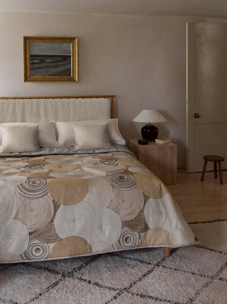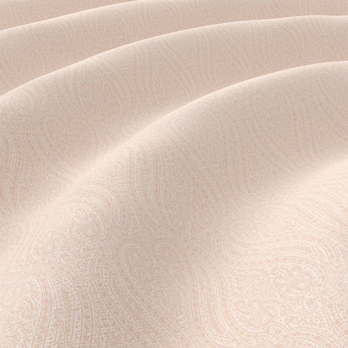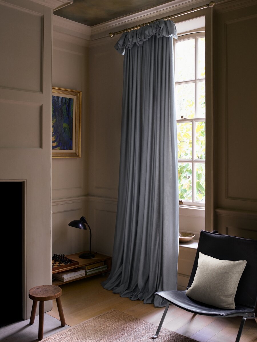 Der prächtige Seidenwollstoff „Chiswick" mit klassischem Damastmuster ist angelehnt an die prachtvolle Innenausstattung von Chiswick House in London, wo William Kent die Gärten gestaltete. Sanfte Kurven werden durch die subtile Verzerrung des Gewebes gebrochen, die das Design verwischt und weicher wirken lässt, sodass der Eindruck von Wassertropfen entsteht, die aus einem Brunnen herabfallen.