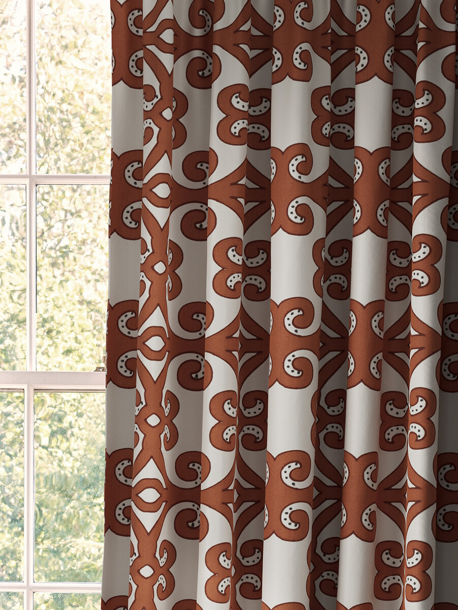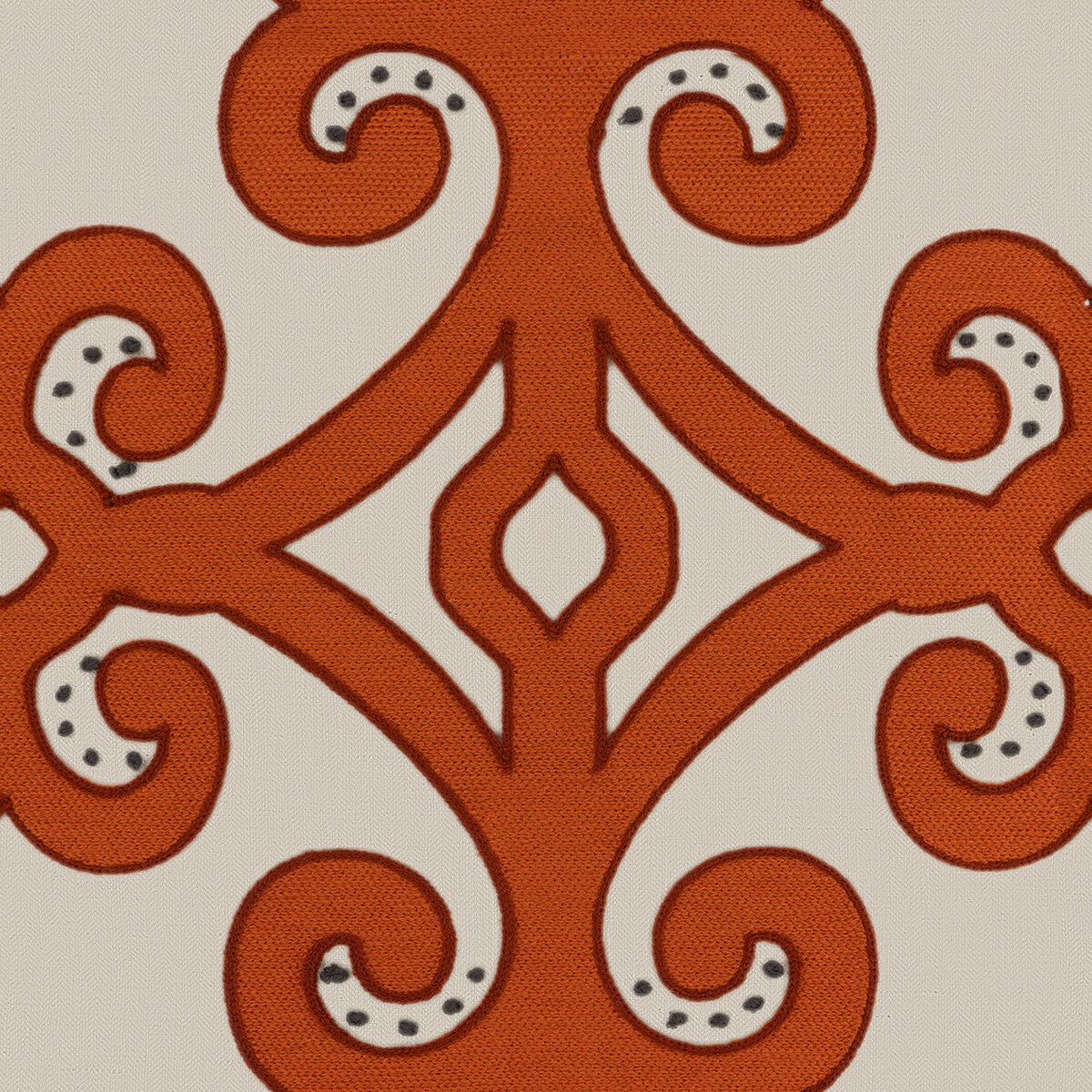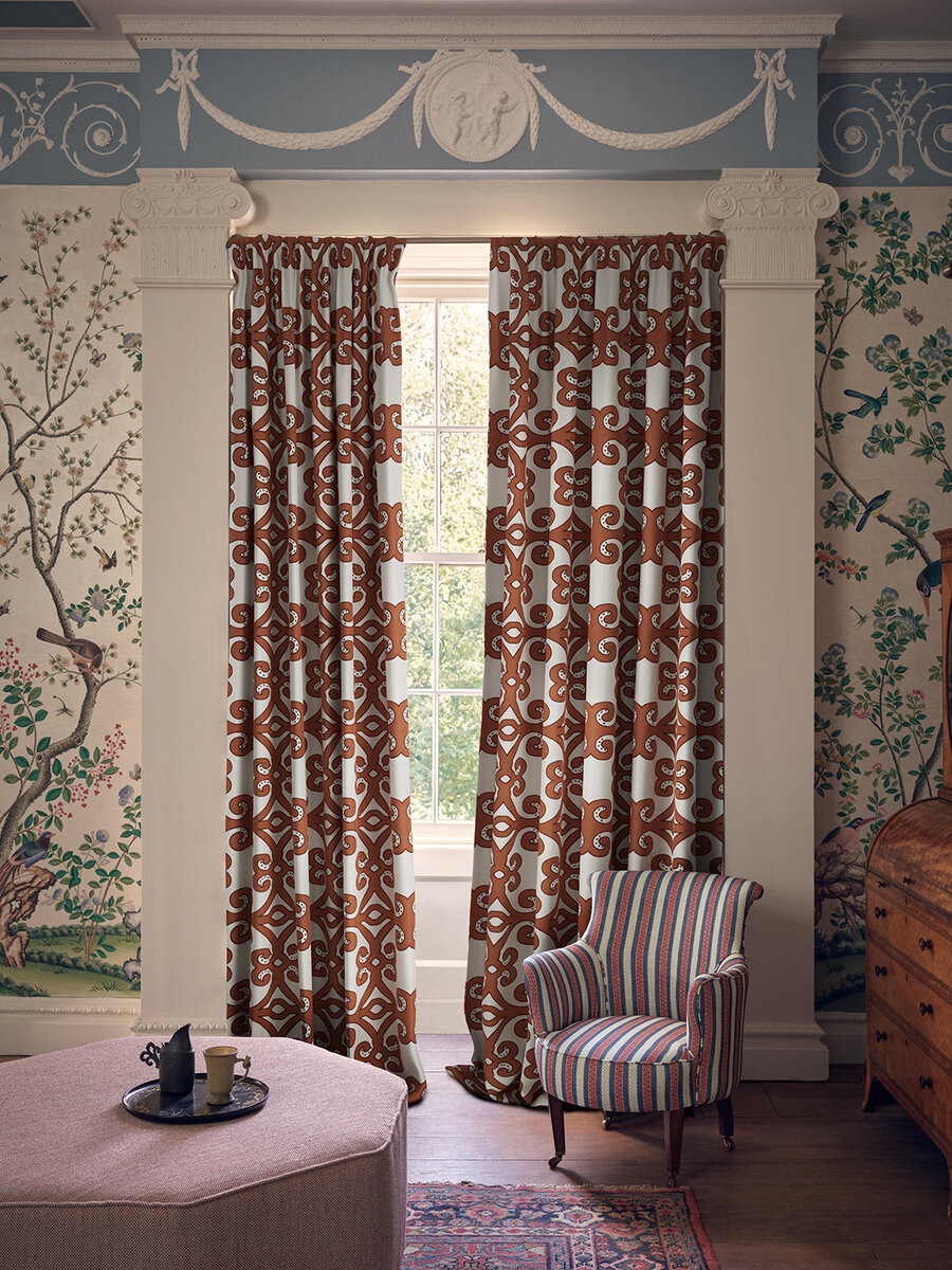 Das markante Spalierdesign „Collonade", das sich auf die klassische Architektur bezieht, ist ein großformatiges Statement-Design. Die von Hand gestickten französischen Knoten zieren die Kurven des palladianisch inspirierten Knüpfwerks. Sie lockern die Struktur auf, unterstreichen das handwerkliche Geschick und verleihen einer ansonsten traditionellen Formensprache einen modernen Touch.