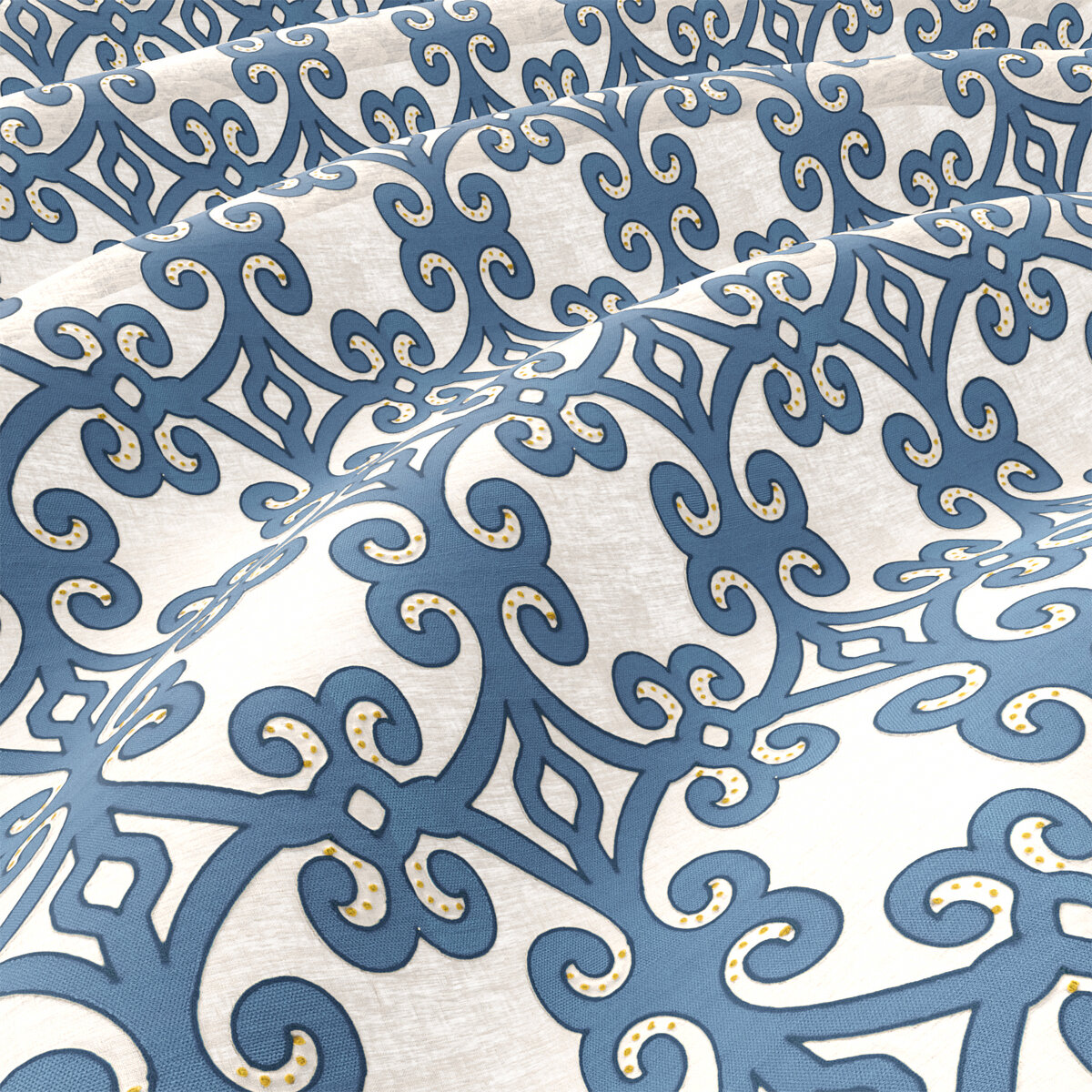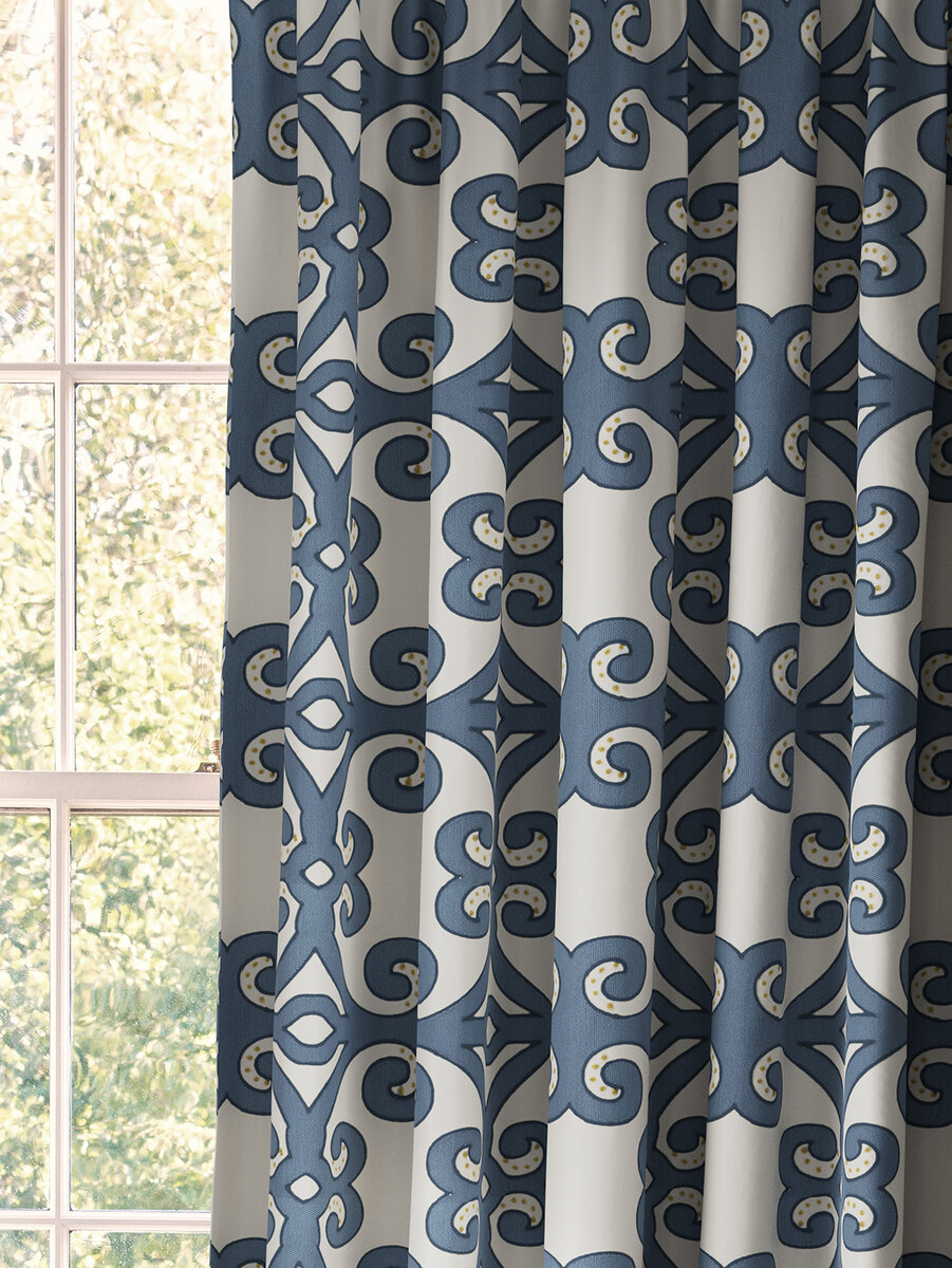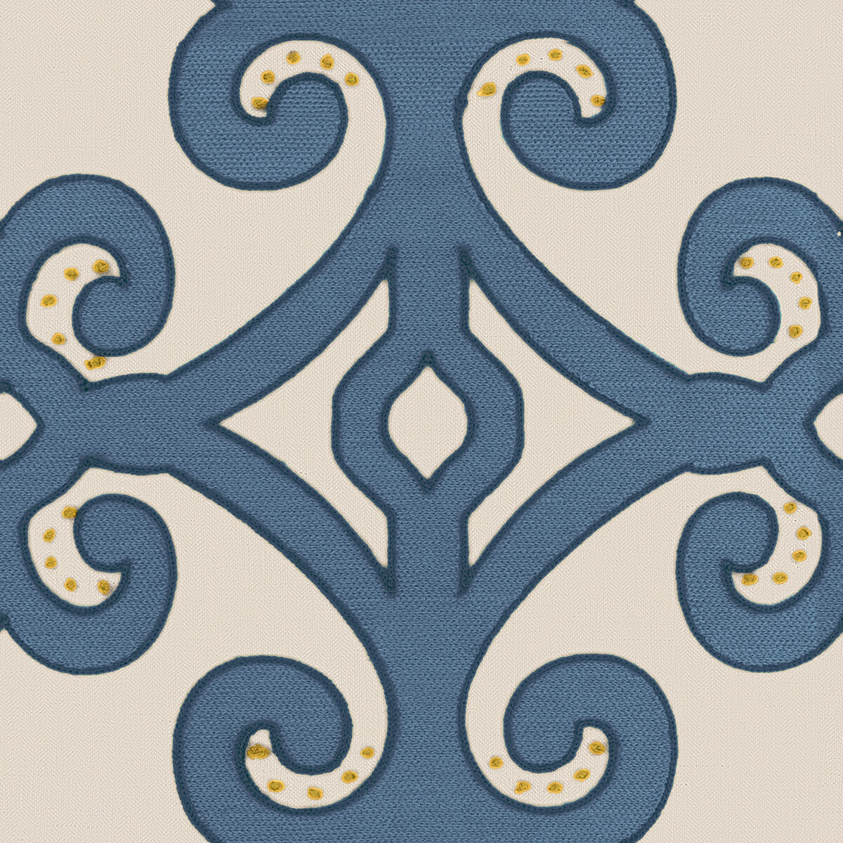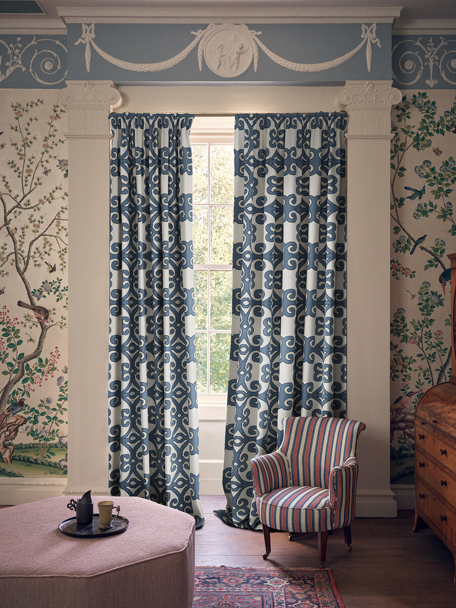 Das markante Spalierdesign „Collonade", das sich auf die klassische Architektur bezieht, ist ein großformatiges Statement-Design. Die von Hand gestickten französischen Knoten zieren die Kurven des palladianisch inspirierten Knüpfwerks. Sie lockern die Struktur auf, unterstreichen das handwerkliche Geschick und verleihen einer ansonsten traditionellen Formensprache einen modernen Touch.