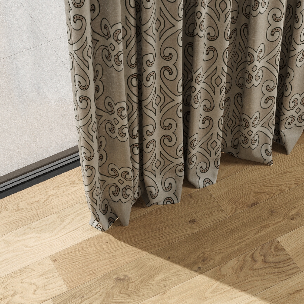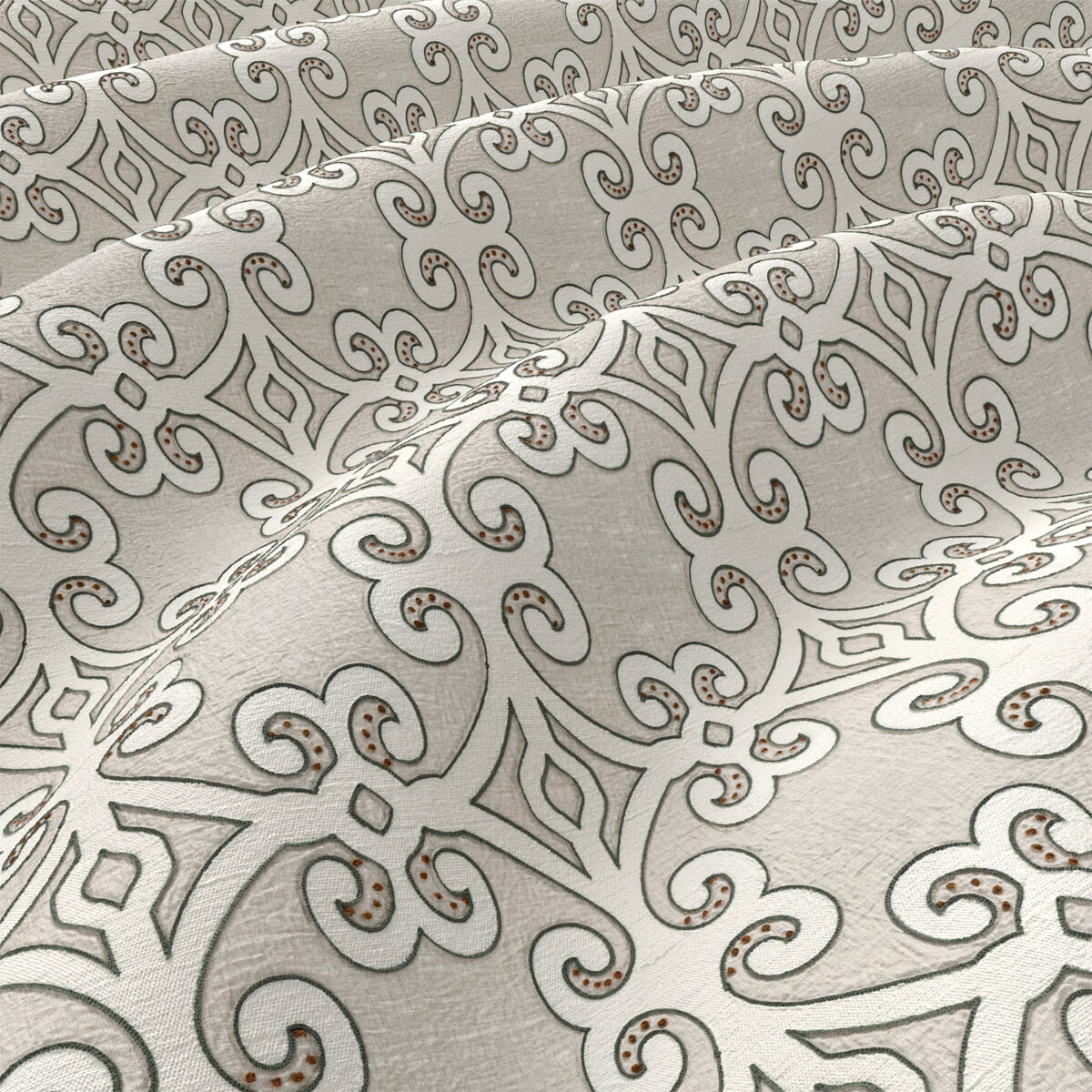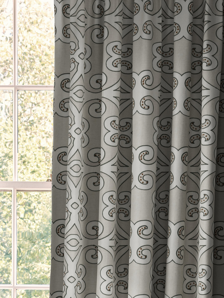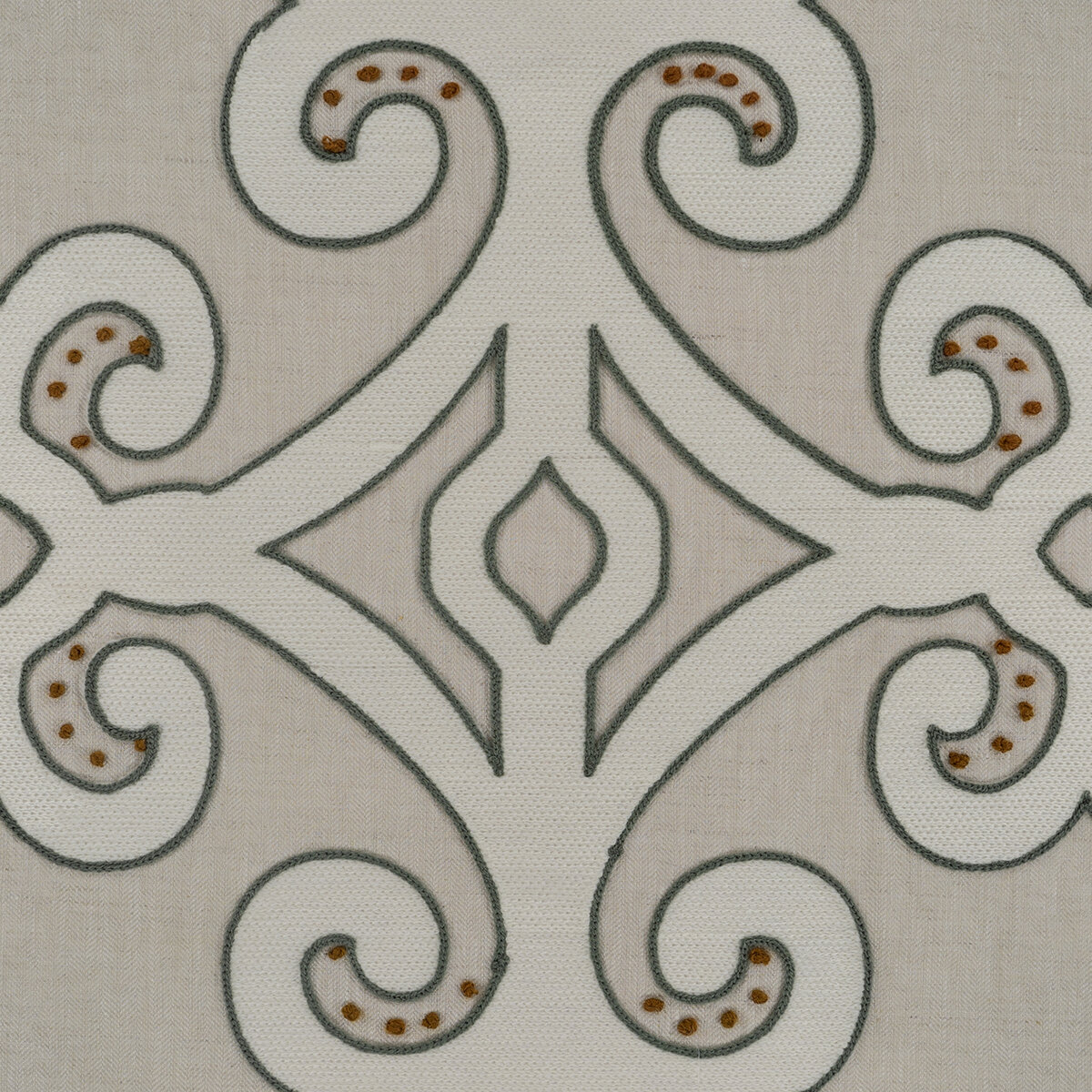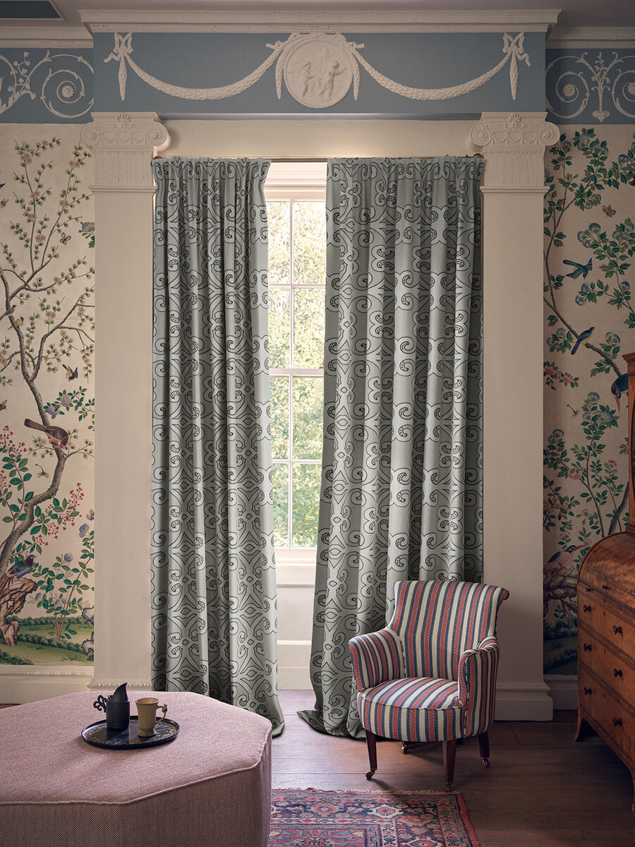 Das markante Spalierdesign „Collonade", das sich auf die klassische Architektur bezieht, ist ein großformatiges Statement-Design. Die von Hand gestickten französischen Knoten zieren die Kurven des palladianisch inspirierten Knüpfwerks. Sie lockern die Struktur auf, unterstreichen das handwerkliche Geschick und verleihen einer ansonsten traditionellen Formensprache einen modernen Touch.