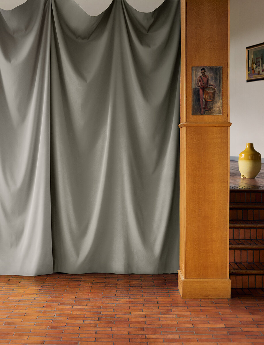 Raumhoch und schwer entflammbar besteht dieser universell einsetzbare Dekostoff zu 100 % aus recycelbarem, schwer entflammbarem Polyester (Trevira CS).