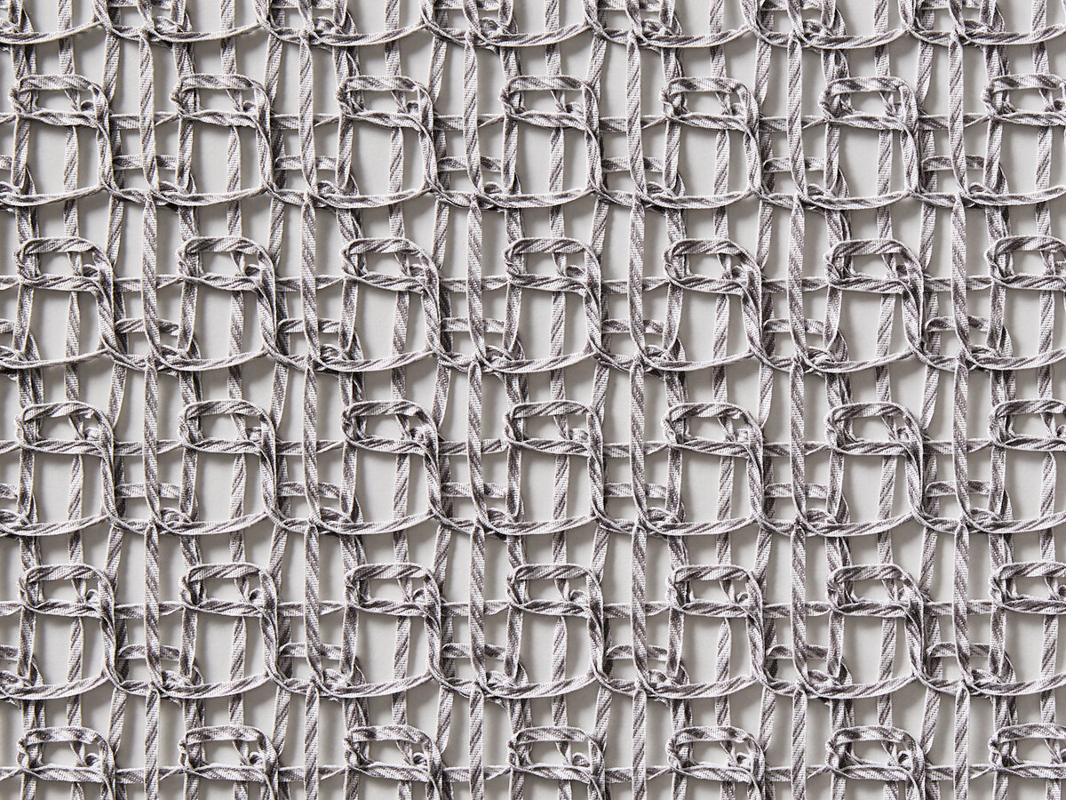 DASHY ist eine inspirierende Mixtur aus der großmaschigen Textur handgeflochtener Netze und moderner Spitzenoptik. Zweifarbig, diagonal gestreifte Gewebe-Bändchen wurden in innovativer Applikations-Technik zusammengeführt und verleihen dem lichtdurchlässigen Inbetween einen ausdrucksstarken Look.