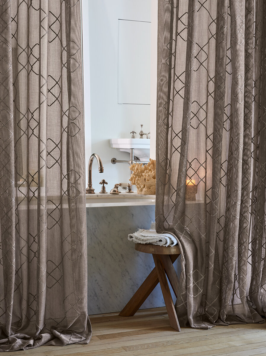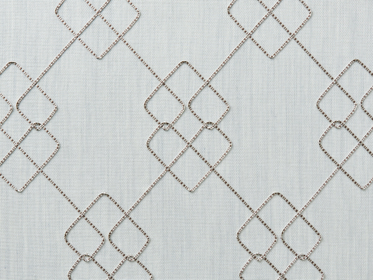Repräsentativer, raumhoher Transparenzartikel mit raffinierter Ausstrahlung. Subtile, zweifarbige Gewebebändchen wurden in innovativer Applikationstechnik rautenförmig auf das Netzgewebe gestickt und verleihen diesem pflegeleichten Textil dadurch seine charmante Prägnanz.