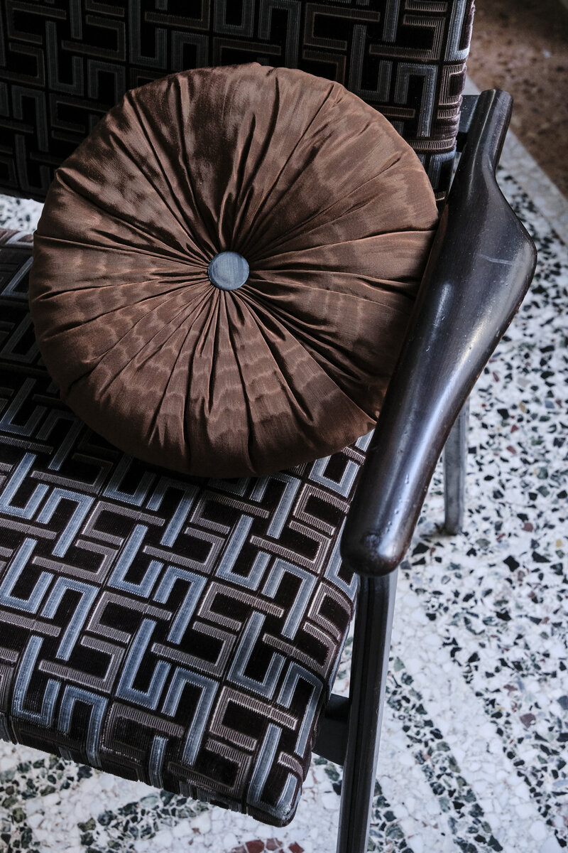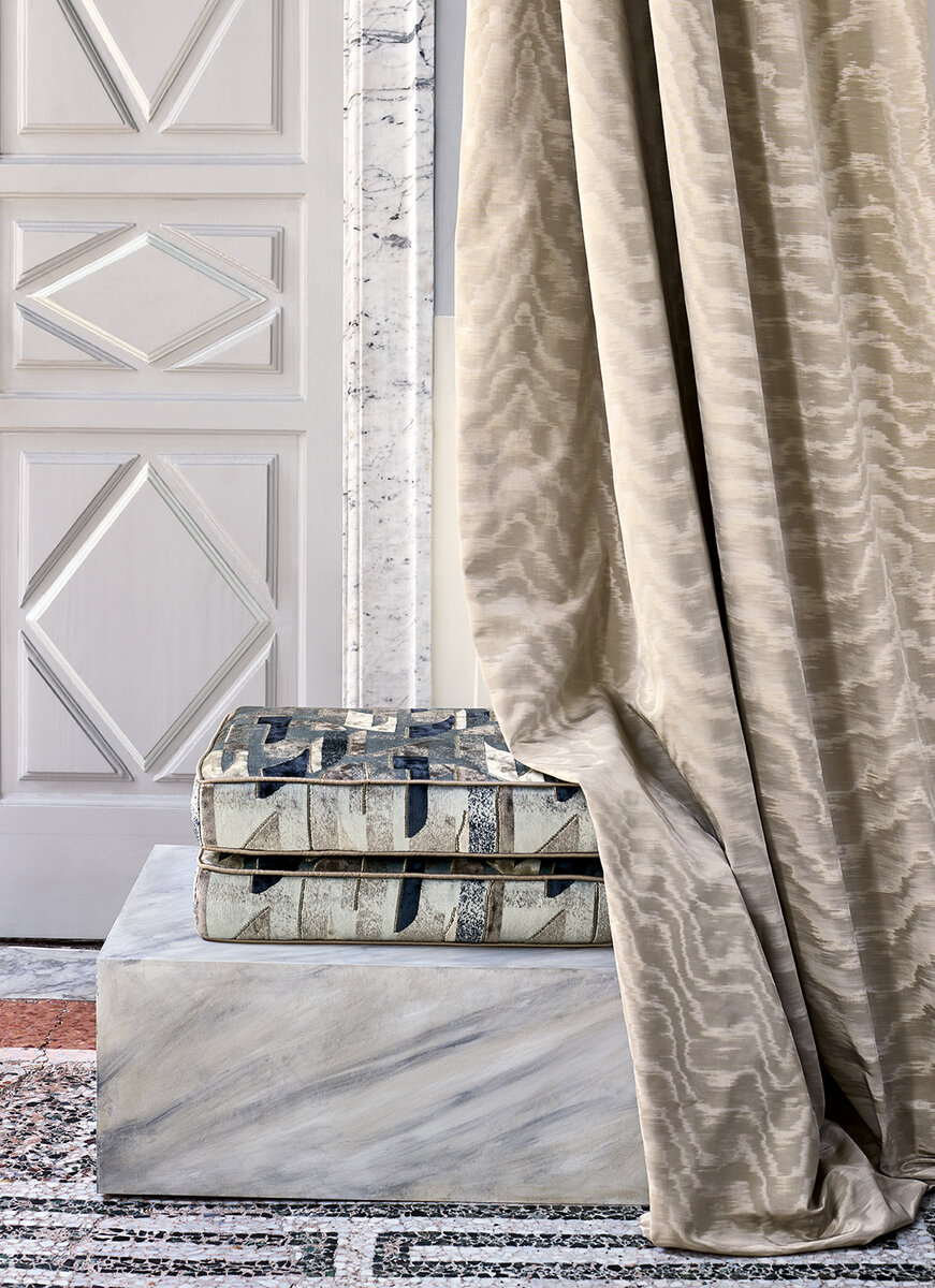 Die Kostbarkeit dieses Moirés wird durch die handwerkliche Note und den sehr anspruchsvollen Entstehungsprozess unterstrichen, wodurch ein fein gezeichnetes, organisches Dessin entsteht.