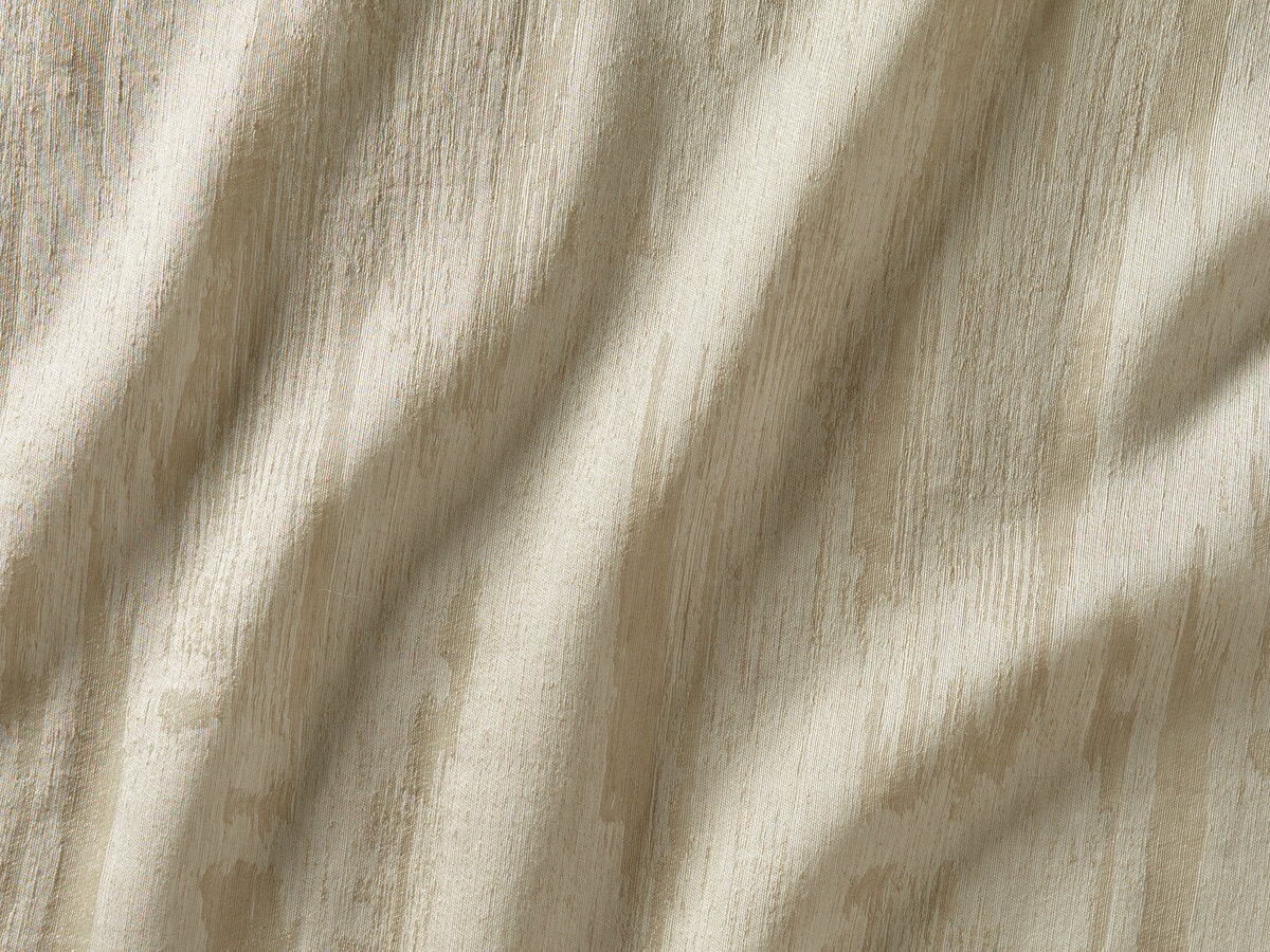 Der Reiz dieser leichten Leinenqualität, farblich nahezu monochrom, beruht auf seinem dezenten Jacquard-Dessin mit vielfältigen Farbschattierungen, die an eine Maserung erinnern. Dieser Transparentstoff wird gestürzt verarbeitet.