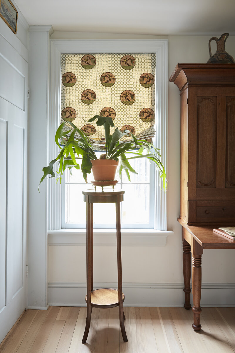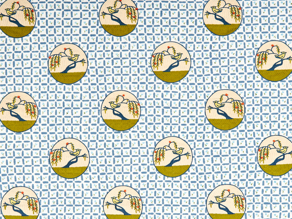 Wir präsentieren: ELIZABETH, einen fröhlichen Blockdruck mit Stickerei auf der Basis freihändiger Pinselstriche, die ein Schachbrettmuster mit einer handgemalten Blume in der Mitte bilden. ELIZABETH wird im Blockdruck auf gefärbten Baumwollstoff übertragen und hat die Ausstrahlung eines rein handwerklichen Stücks. Darüber sind kreisförmige Medaillons gestickt, die eine stilisierte Baum- und Vogel-Vignette in einzigartigen Stichkombinationen darstellen, zu denen auch dicke Handknoten gehören. Dieses elegante Design, ein lebhaftes, fröhliches Statement für Ihr Haus, ist durch seine auffällige Stickerei eigenwillig und zugleich bezaubernd.