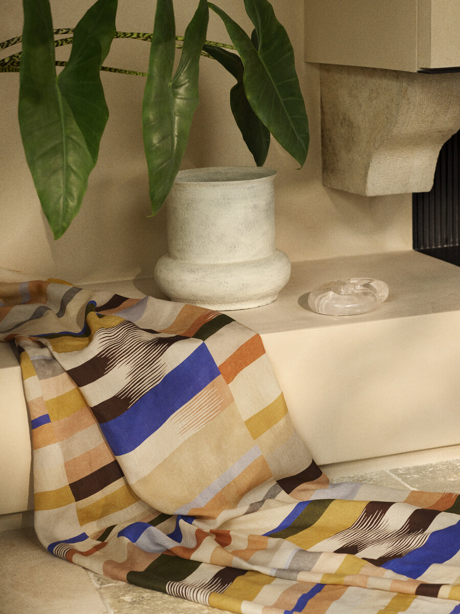 EVASION ist ein Digitaldruck auf einer Basis aus europäischen Flachs-zertifiziertem Leinen, der in Italien am Ufer des Comer Sees hergestellt wird. Seine Farbpalette, sowohl erhaben als auch intensiv, erinnert an eine ferne Reise in den Orient.