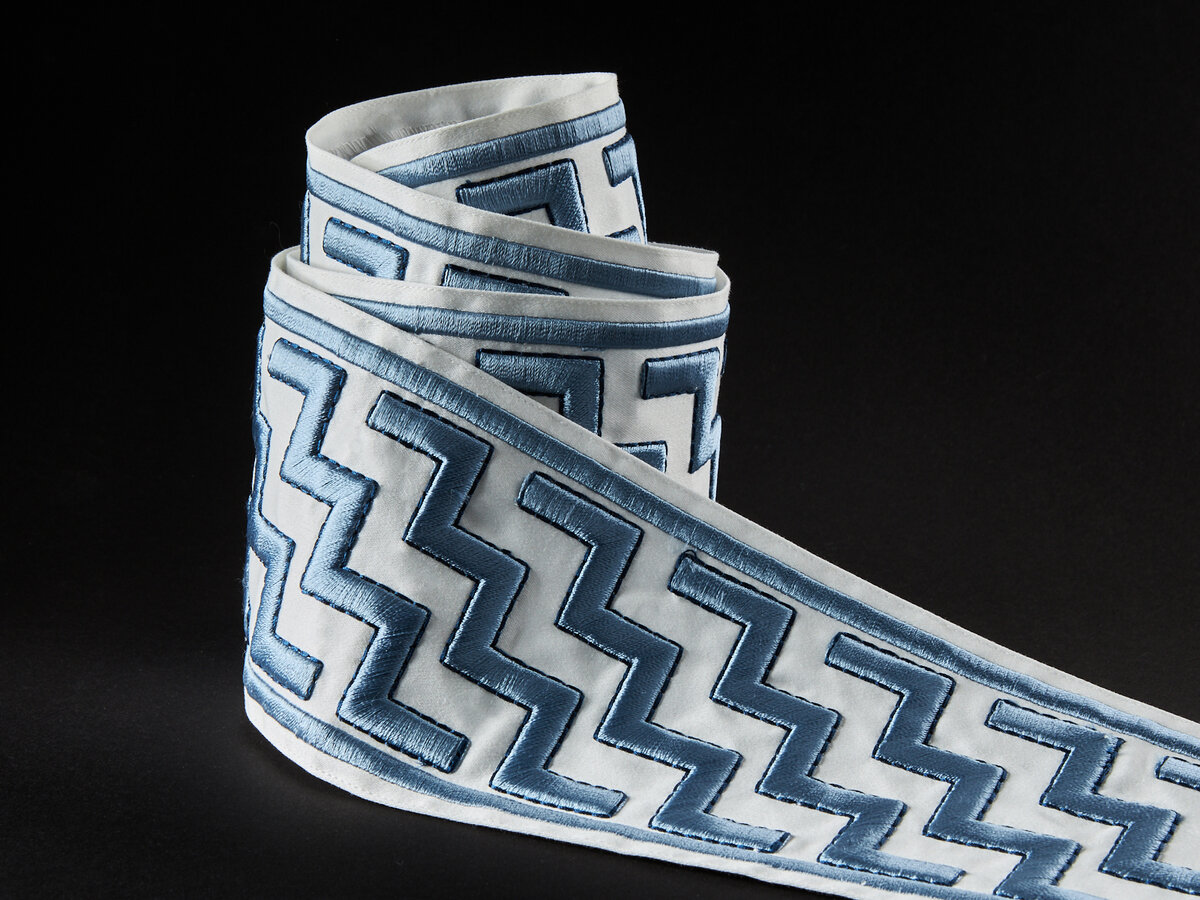Benannt nach Hugh Ferriss, dem in Wolkenkratzer verliebten Architekten und Illustrator, zeichnet sich FERRISS durch ein kühnes geometrisches Labyrinth im Stil einer Metropole aus. Es wird auf einer Stickmaschine mit 18 Köpfen hergestellt, indem der Schaumstoff zunächst präzise auf einer vorgestickten Kontur platziert und dann komplett mit besonders dichtem Plattstich bedeckt wird. Ein zarter Perlstich wird dann am Rand des Designs appliziert und erzeugt eine anmutige, dreidimensionale Stickerei. FERRISS ist in sieben Farben erhältlich und ein echter Hingucker.