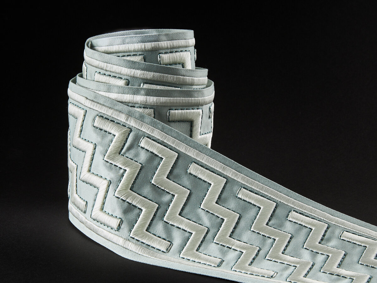 Benannt nach Hugh Ferriss, dem in Wolkenkratzer verliebten Architekten und Illustrator, zeichnet sich FERRISS durch ein kühnes geometrisches Labyrinth im Stil einer Metropole aus. Es wird auf einer Stickmaschine mit 18 Köpfen hergestellt, indem der Schaumstoff zunächst präzise auf einer vorgestickten Kontur platziert und dann komplett mit besonders dichtem Plattstich bedeckt wird. Ein zarter Perlstich wird dann am Rand des Designs appliziert und erzeugt eine anmutige, dreidimensionale Stickerei. FERRISS ist in sieben Farben erhältlich und ein echter Hingucker.