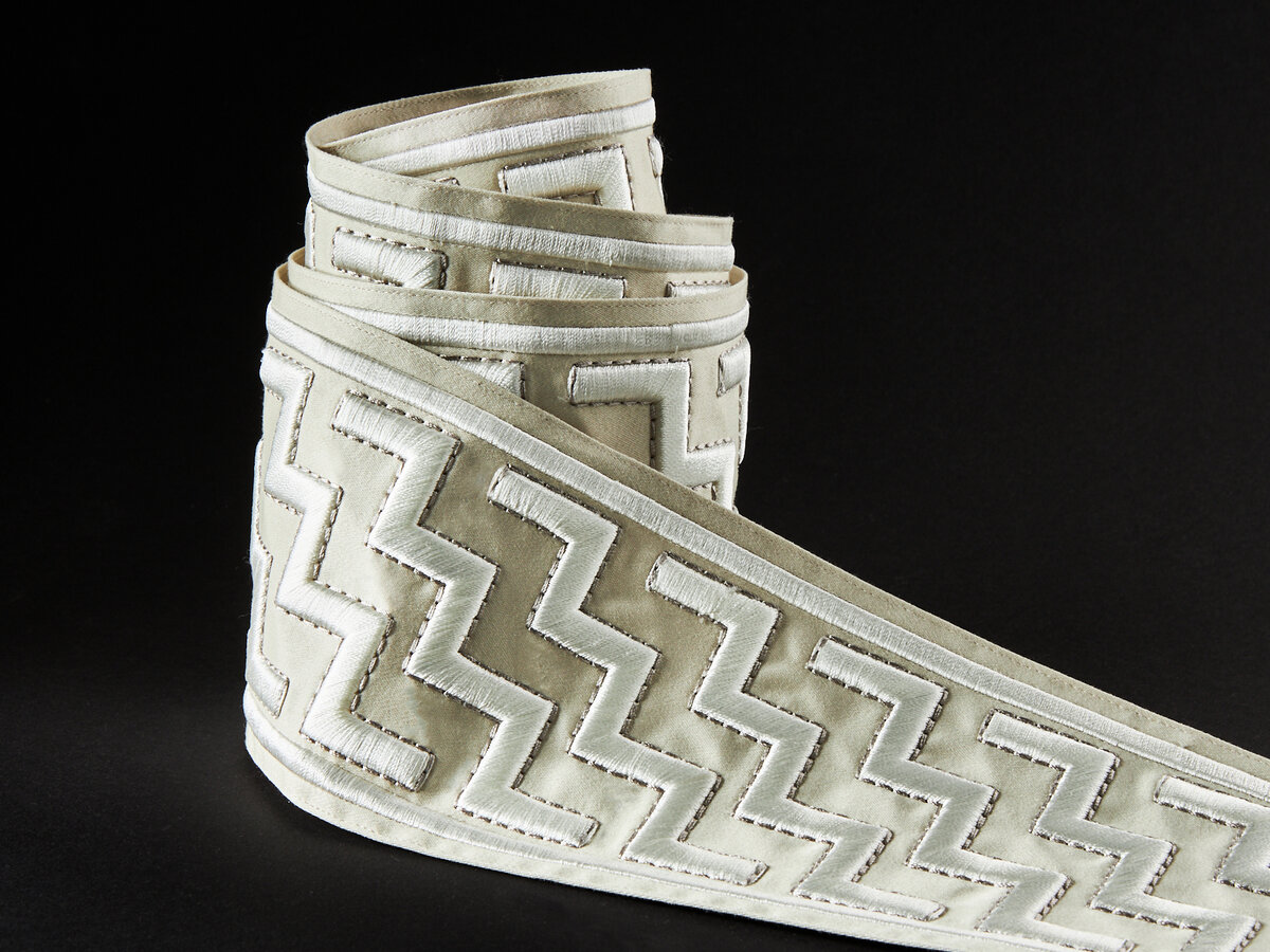 Benannt nach Hugh Ferriss, dem in Wolkenkratzer verliebten Architekten und Illustrator, zeichnet sich FERRISS durch ein kühnes geometrisches Labyrinth im Stil einer Metropole aus. Es wird auf einer Stickmaschine mit 18 Köpfen hergestellt, indem der Schaumstoff zunächst präzise auf einer vorgestickten Kontur platziert und dann komplett mit besonders dichtem Plattstich bedeckt wird. Ein zarter Perlstich wird dann am Rand des Designs appliziert und erzeugt eine anmutige, dreidimensionale Stickerei. FERRISS ist in sieben Farben erhältlich und ein echter Hingucker.