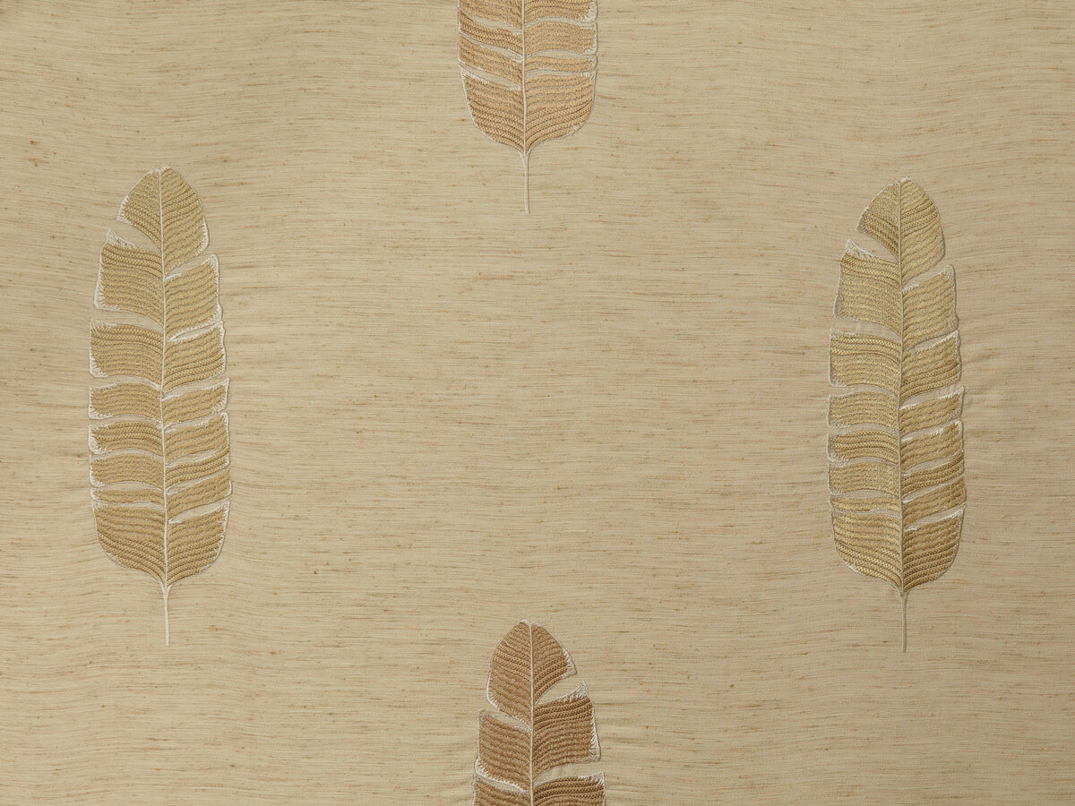Eine reiche Stickerei bildet das Motiv des Bananenblattes, das rhythmisch auf einem, an Wildseide erinnernden, Fonds angeordnet ist. Das Bananenblatt ist in zwei Variationen in zueinander komponierten Farben ausgeführt.