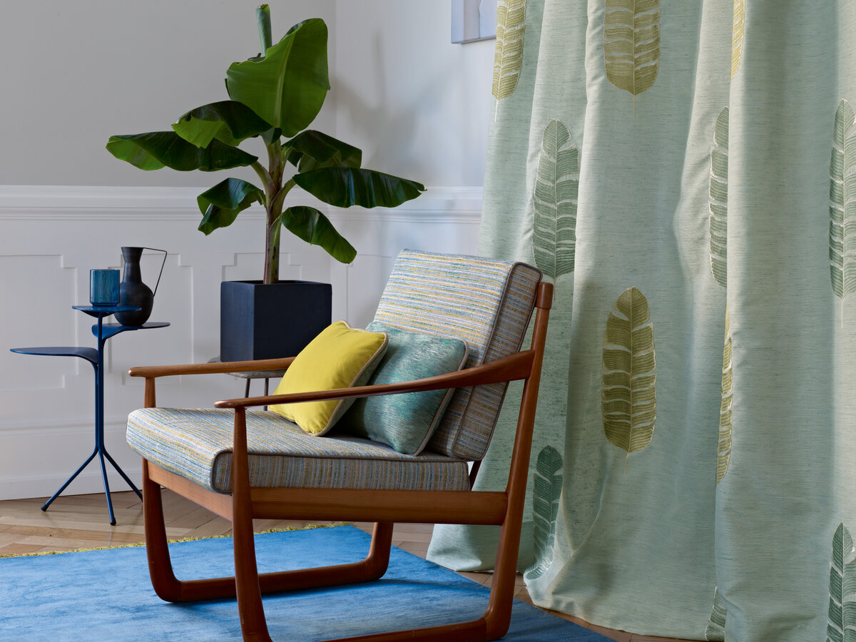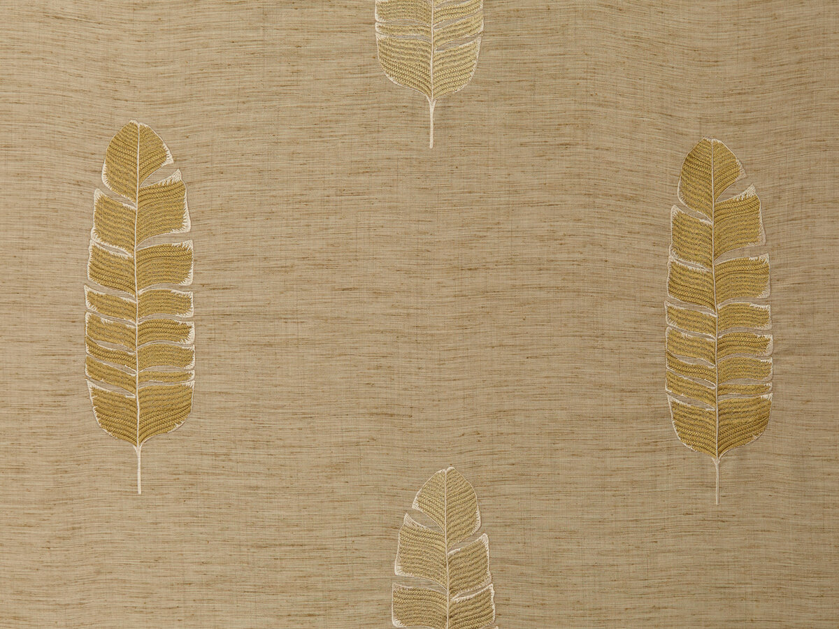 Eine reiche Stickerei bildet das Motiv des Bananenblattes, das rhythmisch auf einem, an Wildseide erinnernden, Fonds angeordnet ist. Das Bananenblatt ist in zwei Variationen in zueinander komponierten Farben ausgeführt.