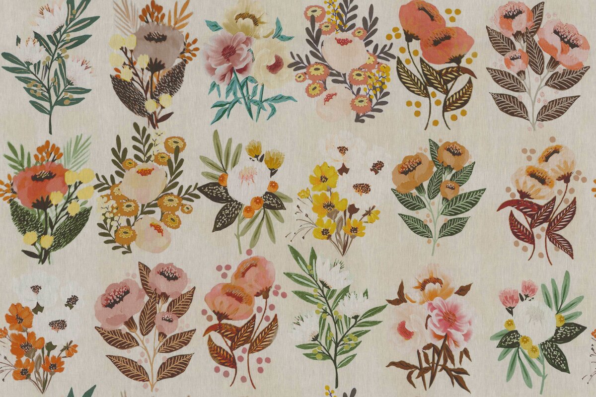 Auf langfaserigem 100% Leinen entstehen farbkräftige, tanzende Blumenbouquets. Die weiche Ausrüstung sorgt für einen modernen Charakter und einen perfekten Fall.