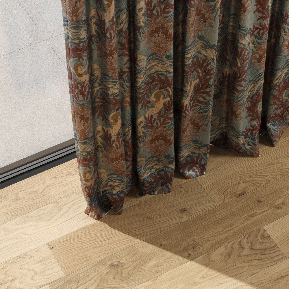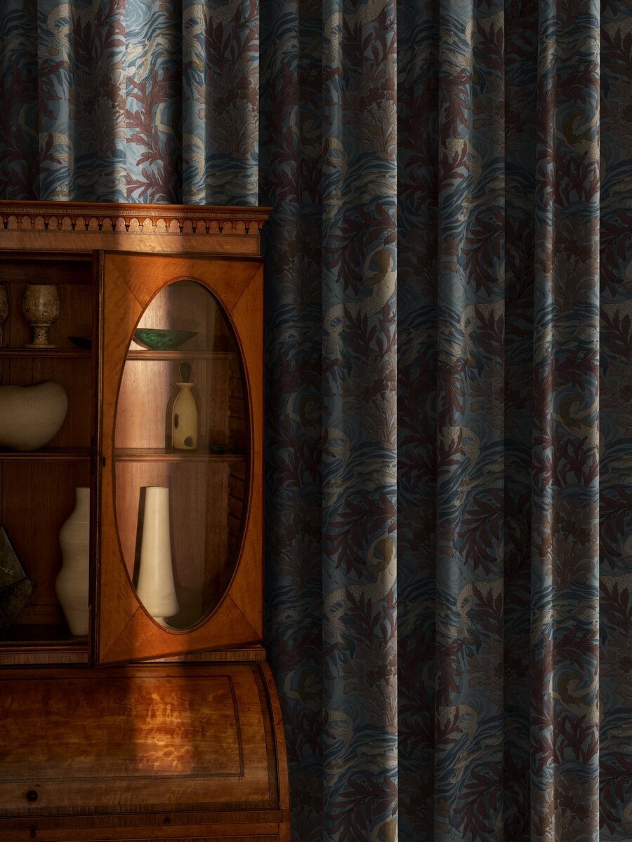 Das atemberaubende und einzigartige traditionelle Design „Folklore" zeigt die Meerjungfrauen von Odysseus, die anmutig zwischen Korallenriffen auf dem Meeresgrund schwimmen, während sanfte Wellen um sie herum schwappen. Gedruckt auf einem dezent glänzenden Leinensatin, erhält das Design einen sphärischen Schimmer, wenn das Licht von der Oberfläche zurückgeworfen wird, wie Sonnenlicht auf Wasser.