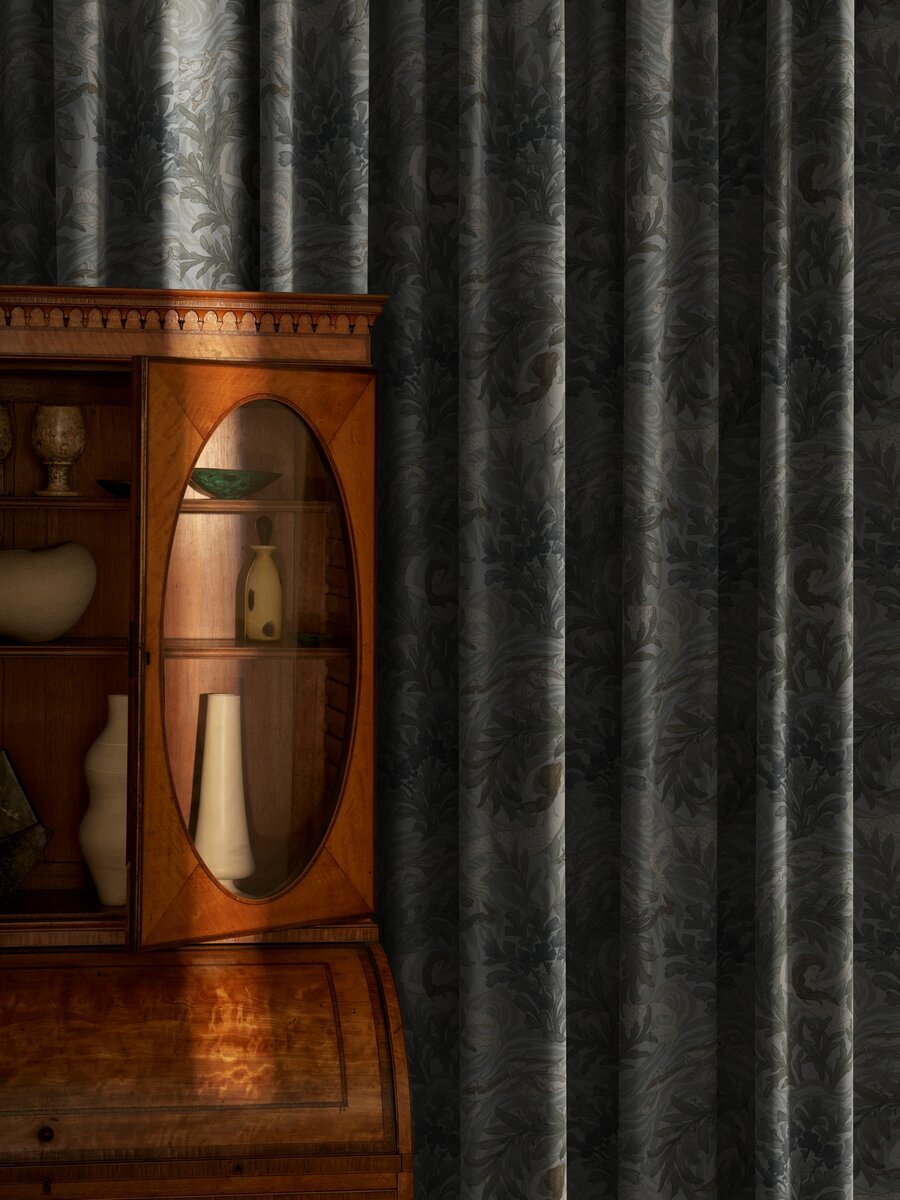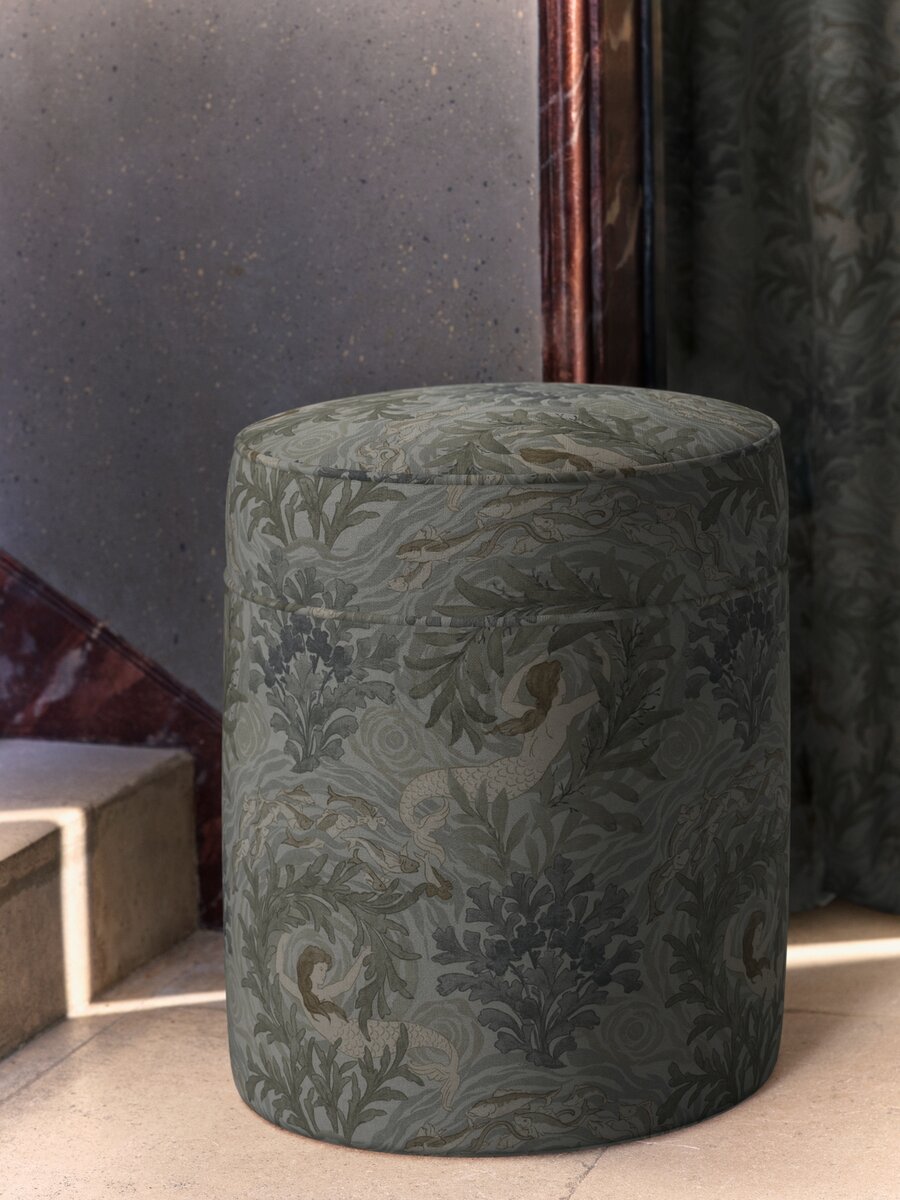 Das atemberaubende und einzigartige traditionelle Design „Folklore" zeigt die Meerjungfrauen von Odysseus, die anmutig zwischen Korallenriffen auf dem Meeresgrund schwimmen, während sanfte Wellen um sie herum schwappen. Gedruckt auf einem dezent glänzenden Leinensatin, erhält das Design einen sphärischen Schimmer, wenn das Licht von der Oberfläche zurückgeworfen wird, wie Sonnenlicht auf Wasser.