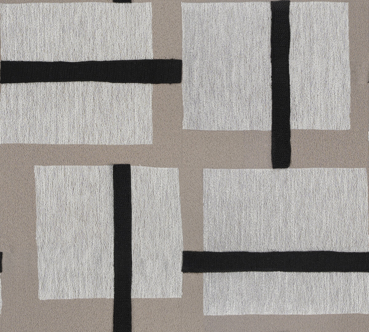 Zwei simple, archaische Formen. Quadrat und Streifen formieren sich zu einem großzügigen Karo-Muster. Der rechte Winkel wird durch die Unregelmäßigkeit des Designs und die leicht versetzte Anordnung der Flächen raffiniert unterbrochen und verleiht dem plakativen Design ein rhythmisches Spiel. Durch die aufwändige Kombination von Jacquard-Musterung und Stickerei entsteht zudem eine ausdrucksstarke Relief-Wirkung.