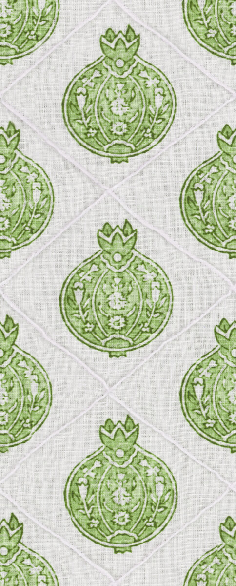 Das Design Granada zeigt Granatäpfel, die von zarten Biesennähten eingerahmt werden, sodass eine Gitteroptik entsteht, die an die fruchtbehangenen Sommerhäuser subtropischer Gärten erinnert. Seit Jahrhunderten steht der Granatapfel für opulenten Luxus und erscheint sowohl in mythischen als auch in religiösen Texten immer wieder als Symbol für Reichtum und Fruchtbarkeit. Der Motiv-Print im Stil einer antiken Schnitzerei wird mit größter Sorgfalt auf reinen Leinenstoff gedruckt. Die perfekte Platzierung ermöglicht die anschließende Veredlung durch Biesennähte.
