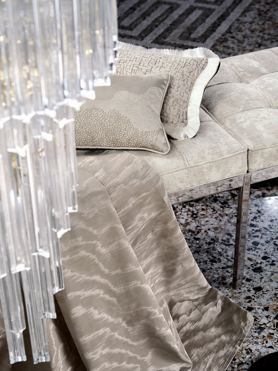 Die zeitlose Dessinierung des Jacquardgewebes IL TRAVERTINO lebt vom Spannungsfeld zwischen Textur und Fläche und spielt dabei mit unterschiedlichen Patina-Effekten.