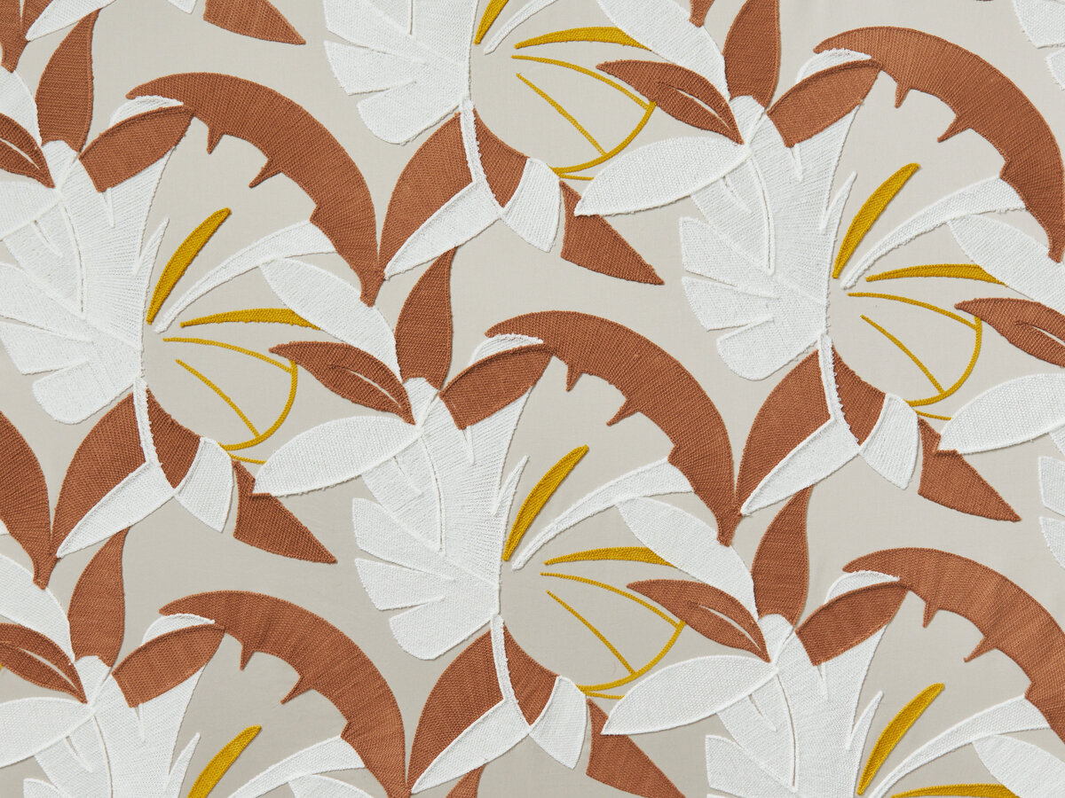 Dieser Stoff mit Stickereien auf Baumwollsatin unterstreicht die Faszination von ETAMINE Paris für botanische Überschwänglichkeit. Wie in einem geheimen Garten vermischen und vermengen sich die Blätter rhythmisch, um eins zu werden. Die Stickereiarbeit ist hier eine Kunst für sich und äußerst langwierig in der Ausführung. Jedes Blatt wird im Kettenstich mit einem matten Wollfaden gestickt. Die Richtung der Stiche folgt behutsam der der Formen.