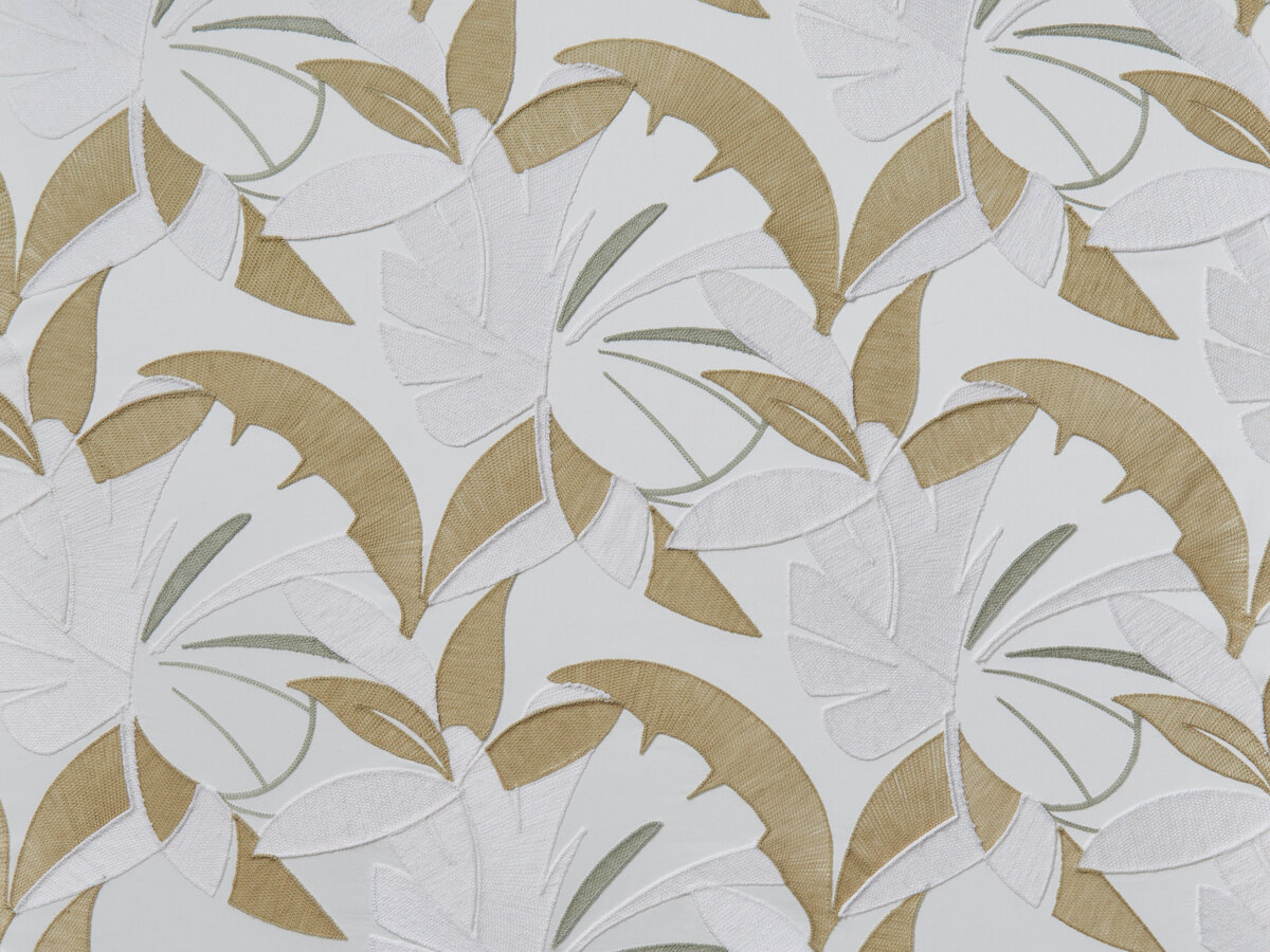 Dieser Stoff mit Stickereien auf Baumwollsatin unterstreicht die Faszination von ETAMINE Paris für botanische Überschwänglichkeit. Wie in einem geheimen Garten vermischen und vermengen sich die Blätter rhythmisch, um eins zu werden. Die Stickereiarbeit ist hier eine Kunst für sich und äußerst langwierig in der Ausführung. Jedes Blatt wird im Kettenstich mit einem matten Wollfaden gestickt. Die Richtung der Stiche folgt behutsam der der Formen.