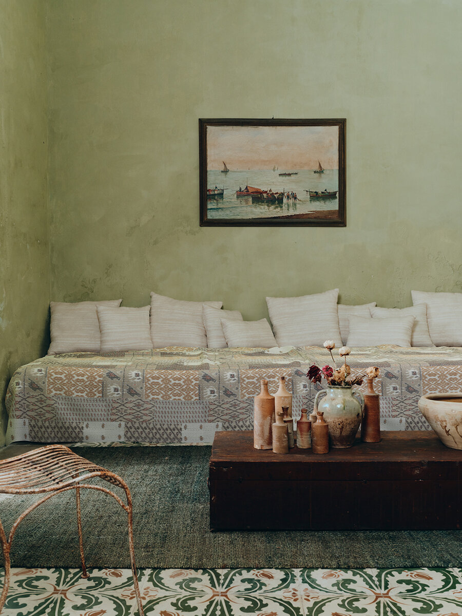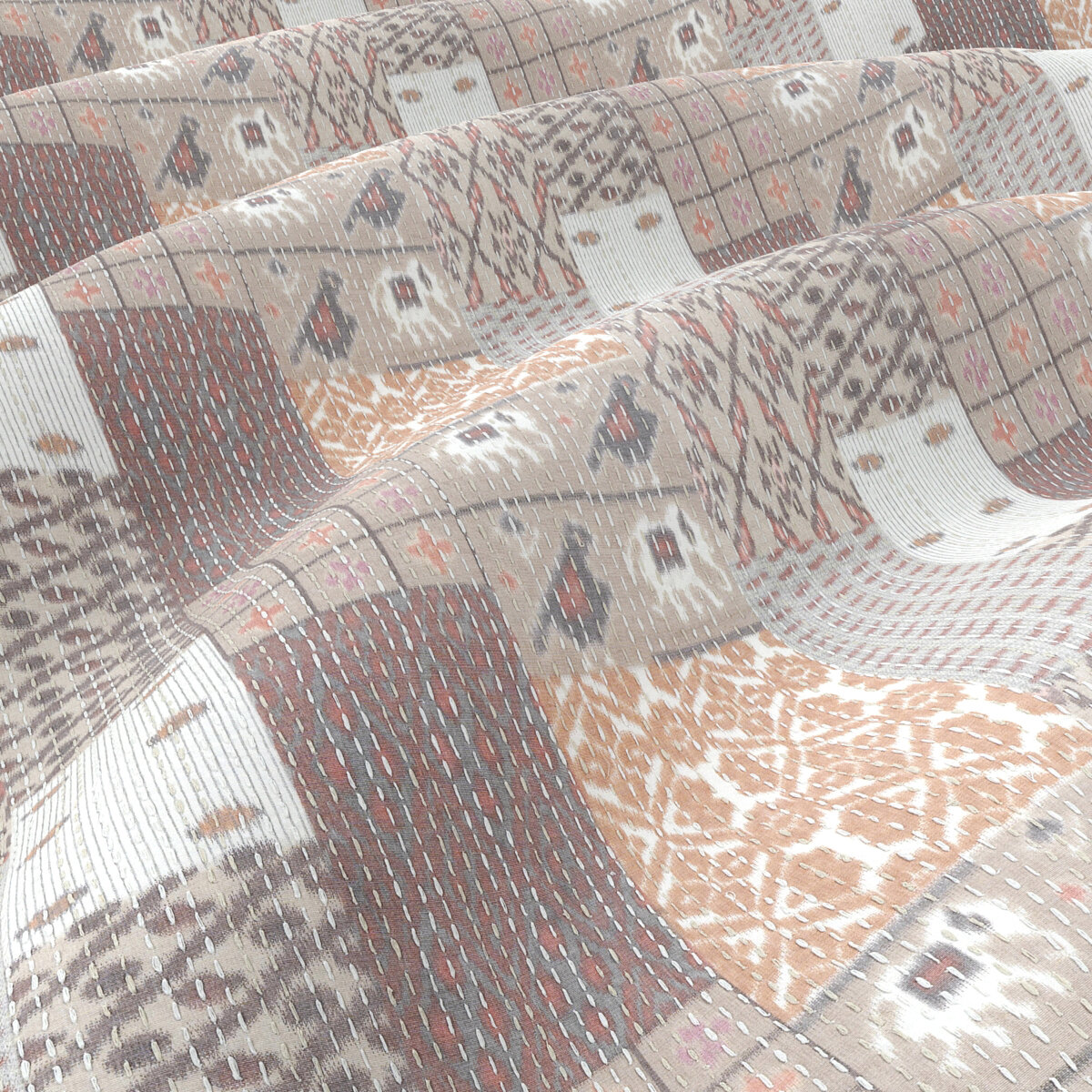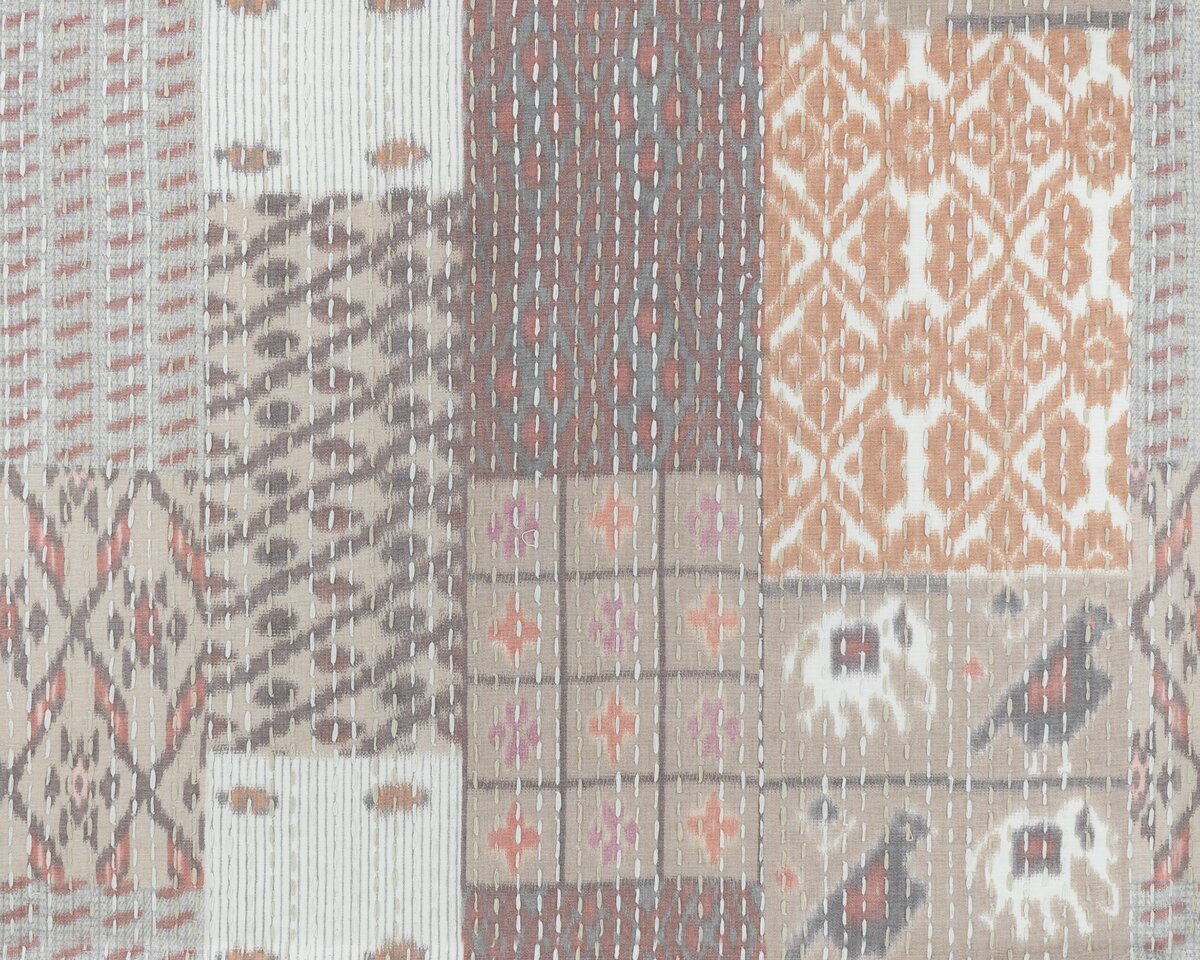 Kantha ist inspiriert von einem antiken, handbestickten indischen Patchwork. Dieser Stoff zeugt von der althergebrachten Meisterleistung von Kunsthandwerkern aus Kerala, Indien: Vor dem Weben wird die Kette in Handarbeit mit 16 Holzrahmen im Siebdruckverfahren bedruckt, um das Patchwork-Design zu erzeugen und die Schönheit seiner Farben zu bewahren. Die Kette besteht aus dichter BCI-Baumwolle und setzt sich aus 5.600 Fäden zusammen. In Frankreich wurden die ersten Boutis im 17. Jahrhundert in der Provence hergestellt.