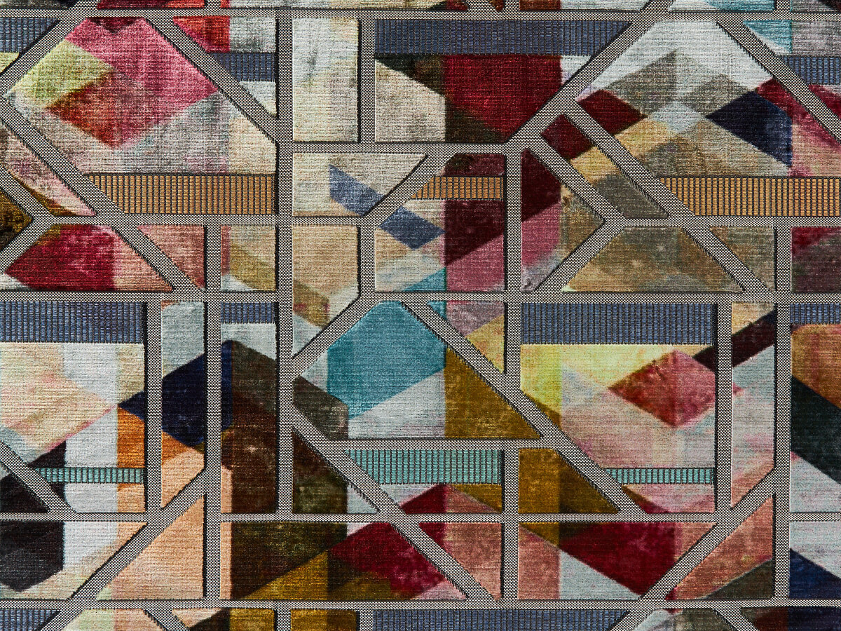Der dekorative Jacquardvelours spielt mit der zufällig wirkenden Kombination von Farbflächen und Geometrie. Ein schillernder Druck, der sich aus unzähligen kleinen polygonalen Flächen zusammensetzt, liegt über dem klaren Raster des geometrischen Jacquard-Designs. Da die beiden Musterungen in zwei separaten Produktionsschritten entstehen, überlagern sich Druckmotiv und Gewebe in wechselnden Formationen und machen KUBIST zum attraktiven Eye-Catcher auf Möbeln oder als dekorativer Vorhangstoff.