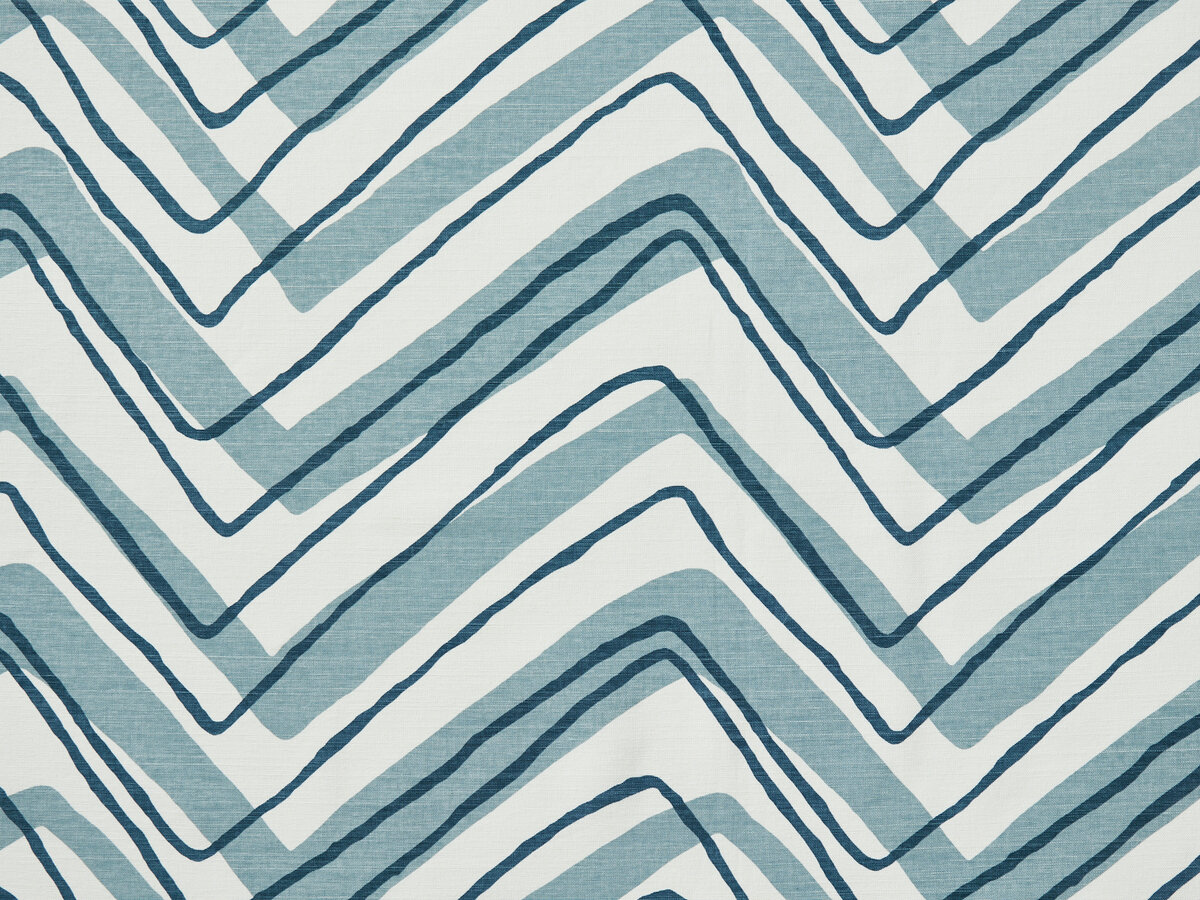 KUDU CHEVRON ist ein weiteres Design, das dem Archiv von Travers entstammt. Dieses verspielte, im Siebdruckverfahren hergestellte Chevronmuster tänzelt leichtfüßig über den Stoff wie eine Kudu-Herde, die durch die Savanne galoppiert. Für das zweifarbige Dessin wird zuerst die breitere Chevron-Linie gedruckt und anschließend direkt mit der dünneren überlagert. Der Druck erfolgt auf einem Baumwoll-Leinen-Gewebe. Die Dichtheit der Pigmentfärbung ist dabei ausschlaggebend für den Erfolg des Designs.