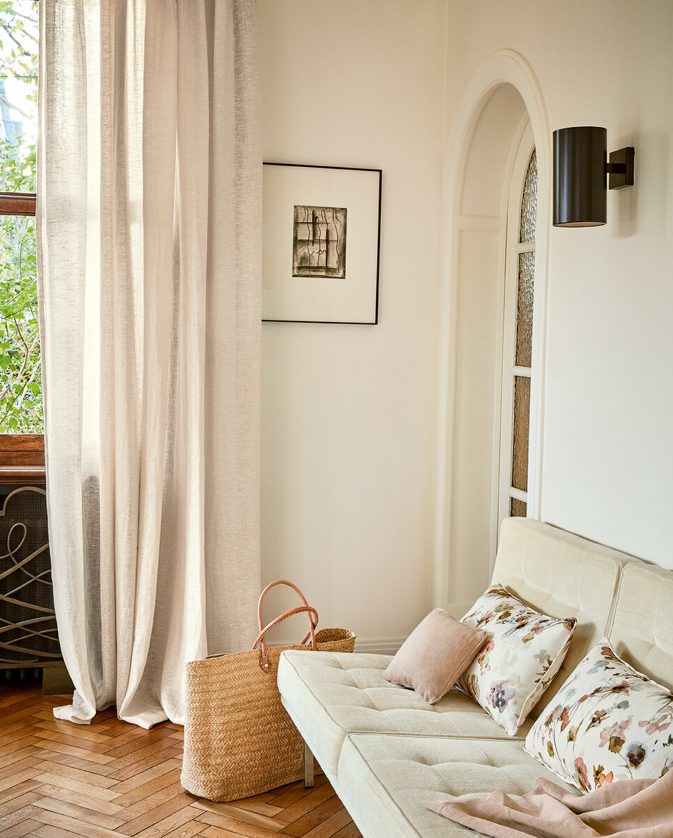 LA COLLE NOIRE ist ein Doppelgewebe in großer Breite. Als Schussfaden wird ein geflammtes, doppelt gefärbtes Baumwollmischgarn verwendet, das für subtile natürliche Farbnuancen sorgt. Für den weichen Baumwollgriff sorgt sein „Soft"-Finish, das die Fasern äußerst zart macht und einen leichten und luftigen Fall verleiht.