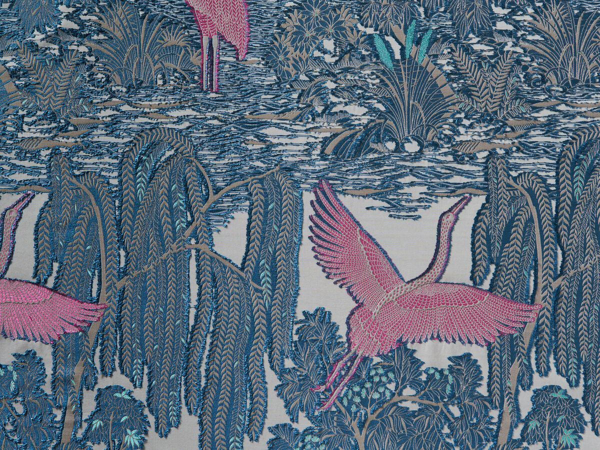 Inspiriert von der Kunst japanischer Landschaftsaquarelle zeigt LAKEVIEW eine idealisierte Seenlandschaft mit einem Kranich, dem asiatischen Symbol für Glück und Langlebigkeit, als Hauptmotiv. Die flottierenden Schussfäden auf der Vorderseite unterstreichen die aufwändige, handwerkliche Herstellungstechnik und heben die Motive plastisch hervor. Ein textiles Meisterwerk mit beeindruckender künstlerischer Ausdruckskraft.