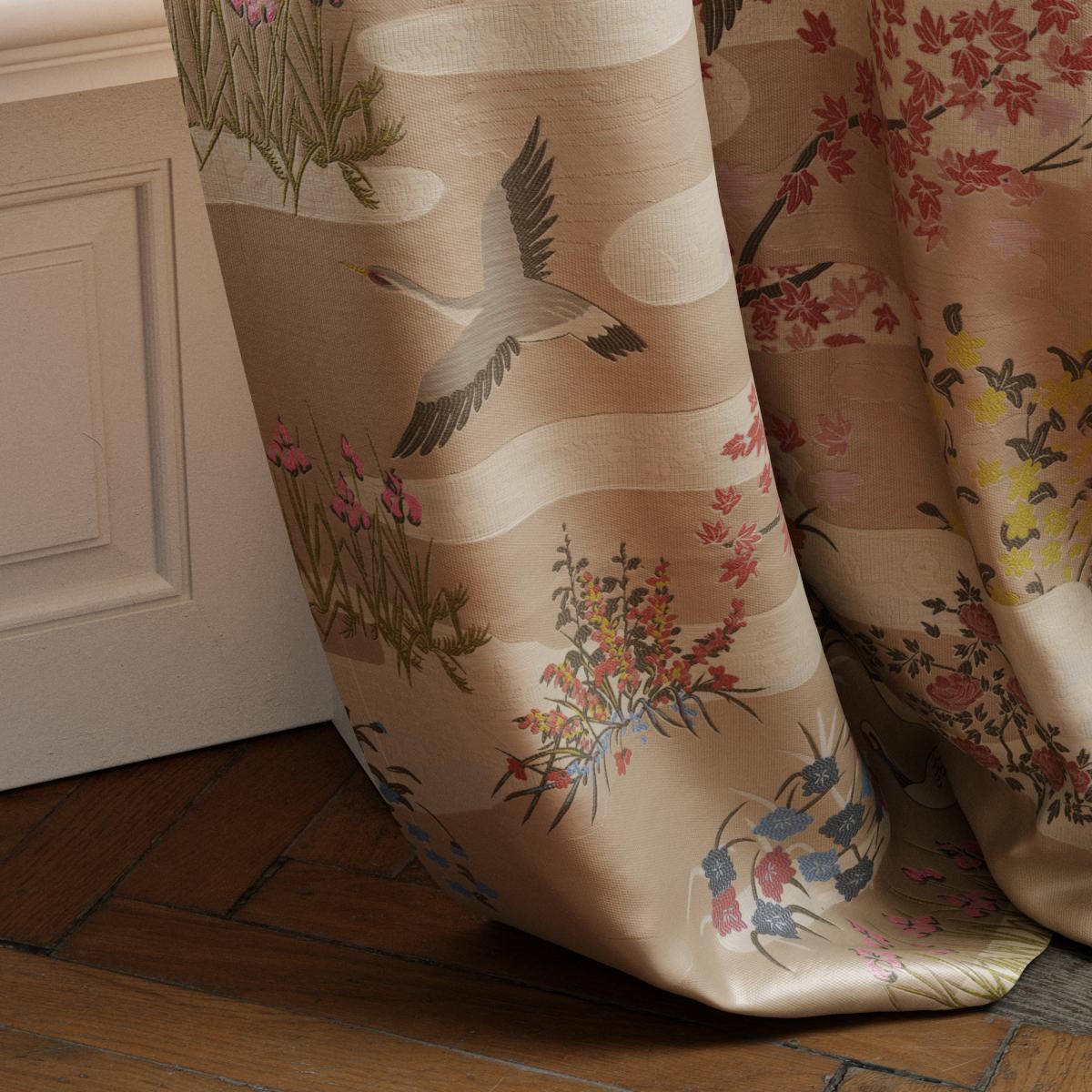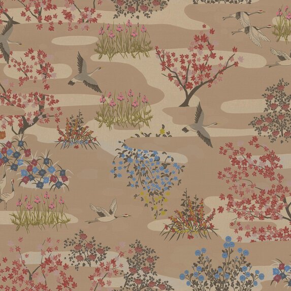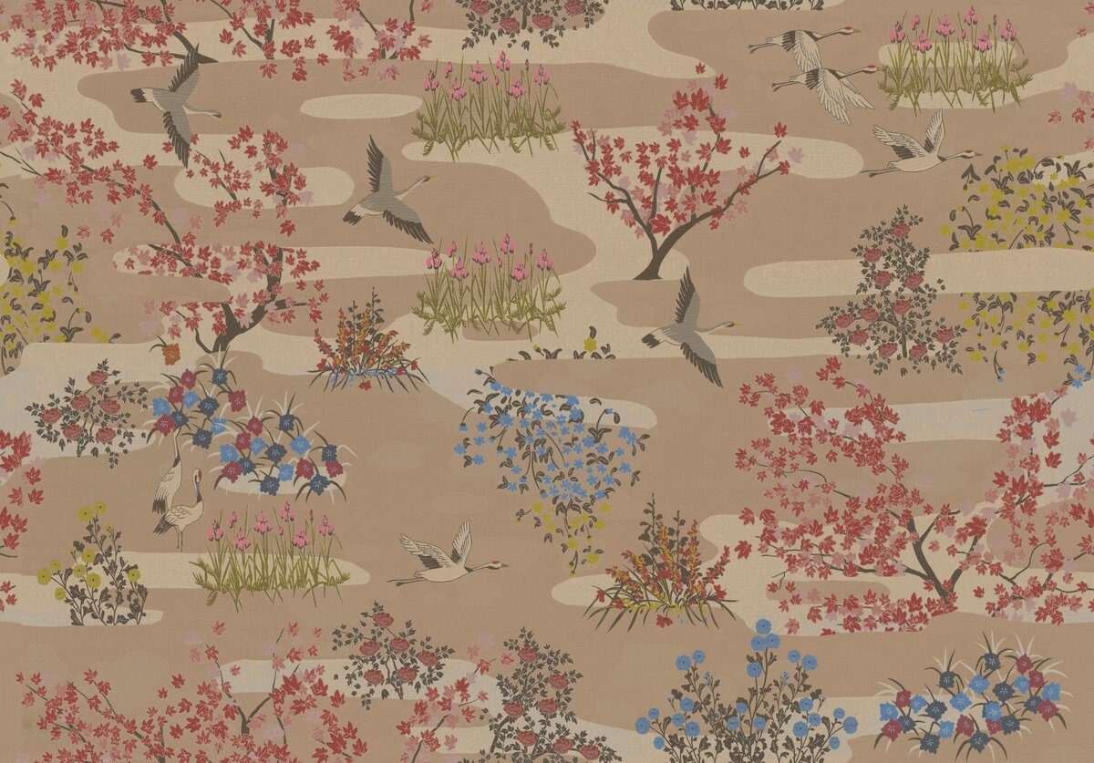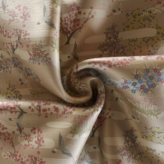 Kraniche, die in der asiatischen Kultur für Glück und Langlebigkeit stehen, gleiten anmutig durch eine frisch erblühte Frühlingsszenerie. Blüten und Blätter erstrahlen im klaren Licht nach einem erfrischenden Regenschauer. In feinster Jacquardtechnik umgesetzt, entfaltet das großzügige Design seine Wirkung durch Detailreichtum und die klare, leuchtende Farbgebung. Jede Szene ist eine Naturerzählung, die zugleich Glück und künstlerische Tiefe vermittelt.