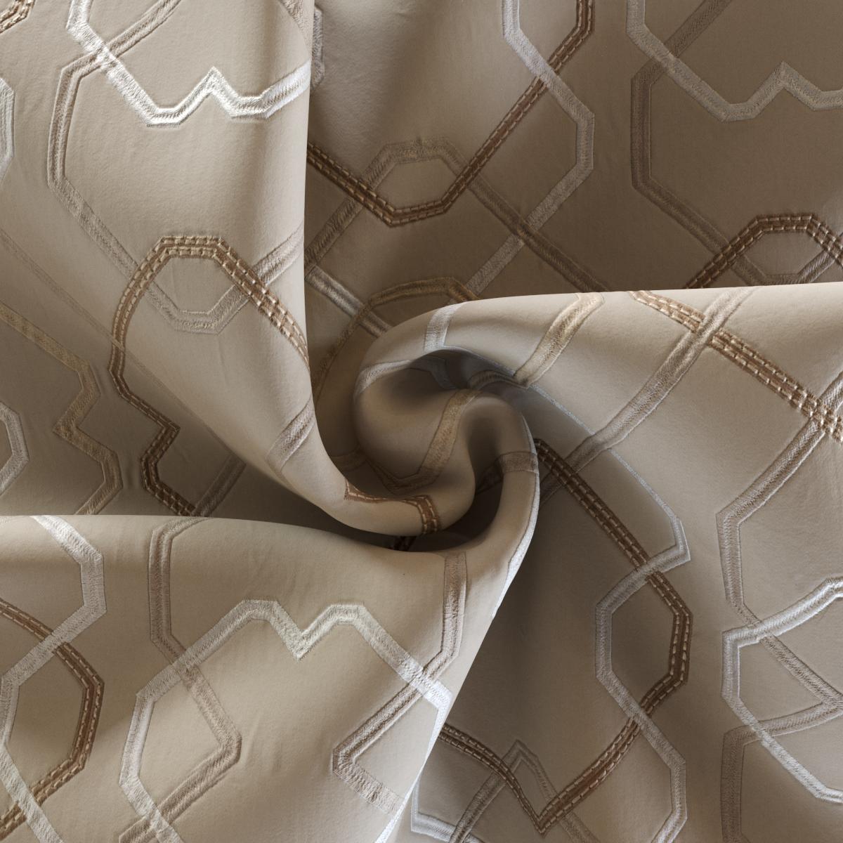 Die edle Stickerei, ausgeführt in verschiedenen Stichtechniken, setzt kunstvolle Akzente auf hochwertigem Baumwollsatin und verleiht dem Stoff eine raffinierte Eleganz.