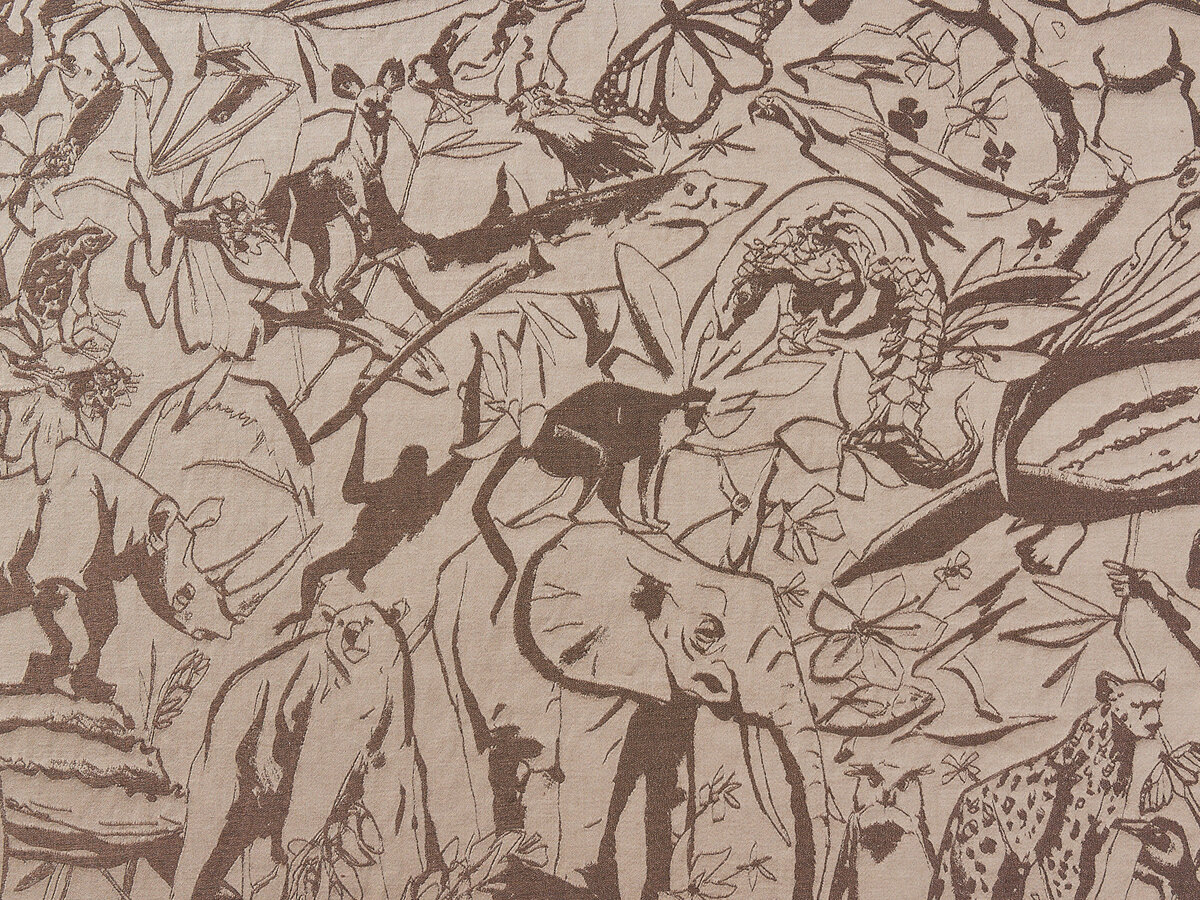 Der Höhepunkt dieser Kollektion ist ONE WORLD, eine illustrative Collage vieler vom Aussterben bedrohter Tierarten in voller Warenbreite, die als edler Jacquard aus Baumwolle und Europäischem Leinen in einer italienischen Weberei umgesetzt wurde. Durch den dezenten Farbkontrast wirkt das Dessin des Dekorationsstoffs am Fenster eher abstrakt, während auf der Fläche der figurative Charakter stärker zum Vorschein kommt. Ein wahres Conversation Piece.