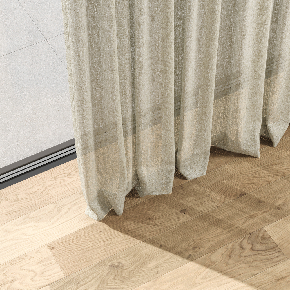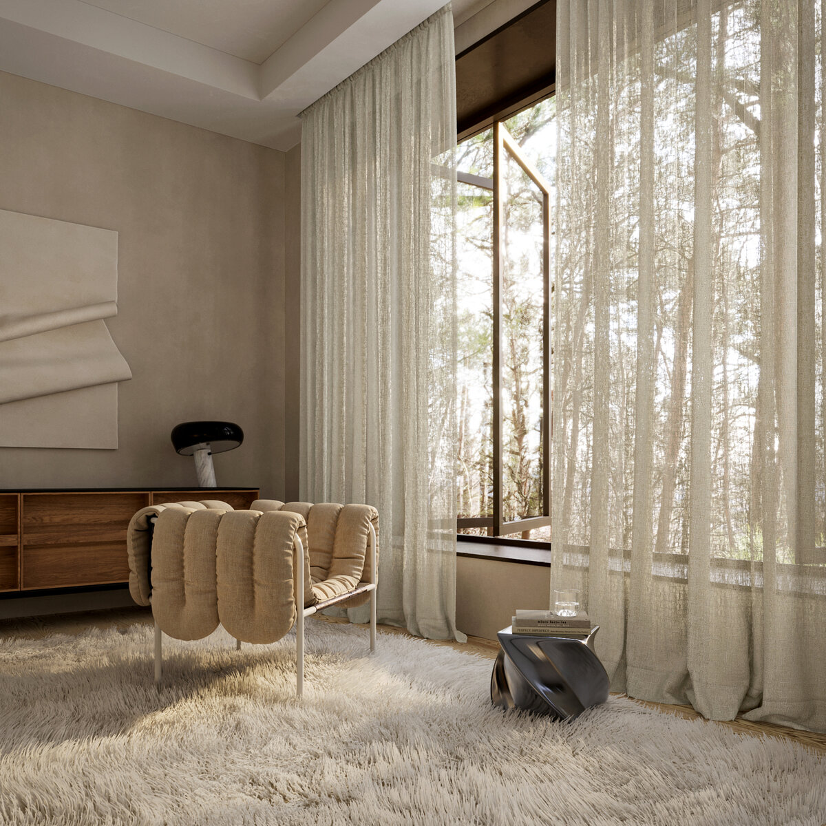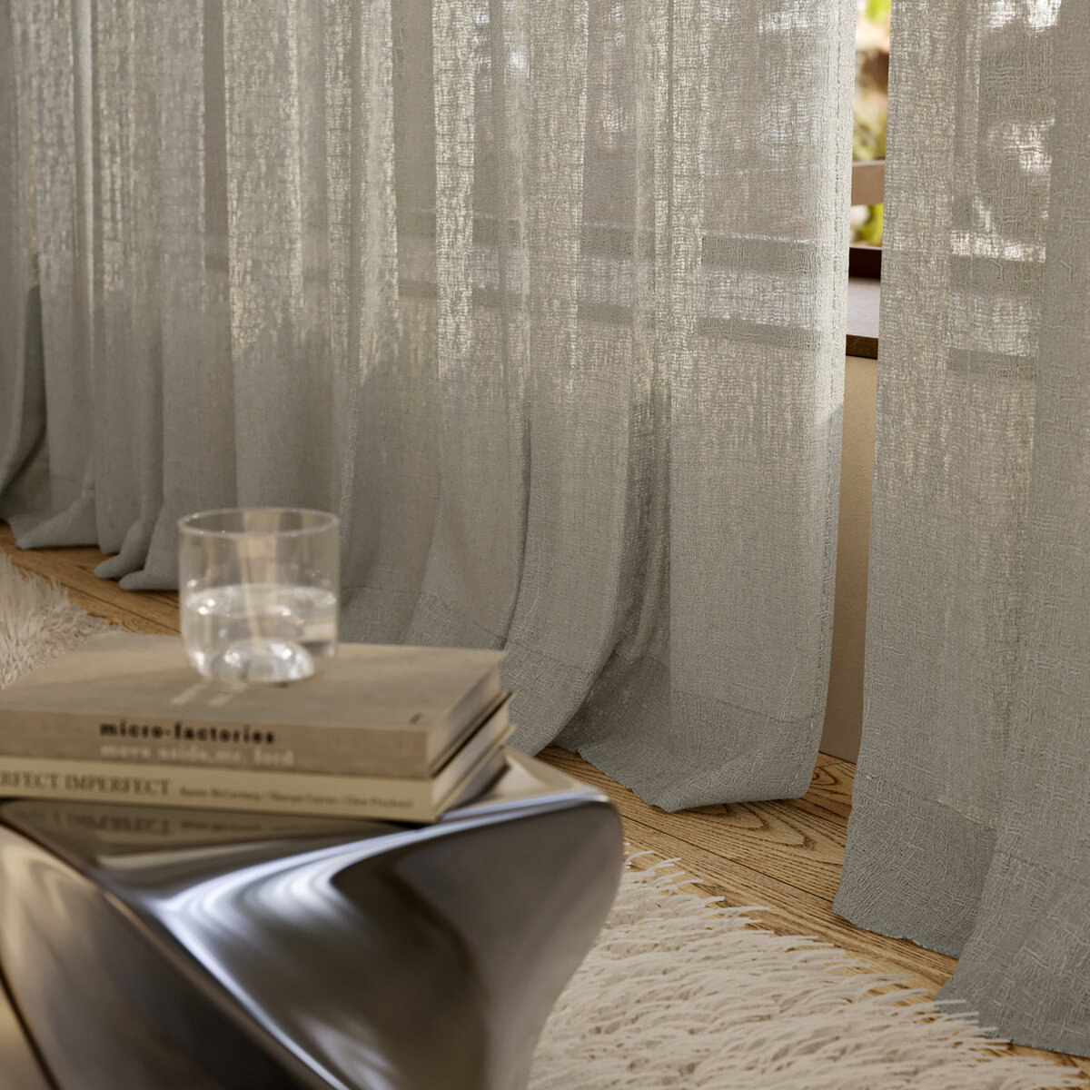 Ooh OOLONG! Dramatisch schön inszeniert das Sonnenlicht die raue und natürliche Struktur des Transparentstoffes. So kommt nicht nur OOLONGs eigene Materialität von 53 % BCI Cotton und 42 % recyceltem Polyester 100 %-ig zur Geltung, sondern auch die der umliegenden Architektur aus Beton, Stahl, Holz oder Glas. Die charaktervolle Wirkung gibt es in naturbetonten Farben.