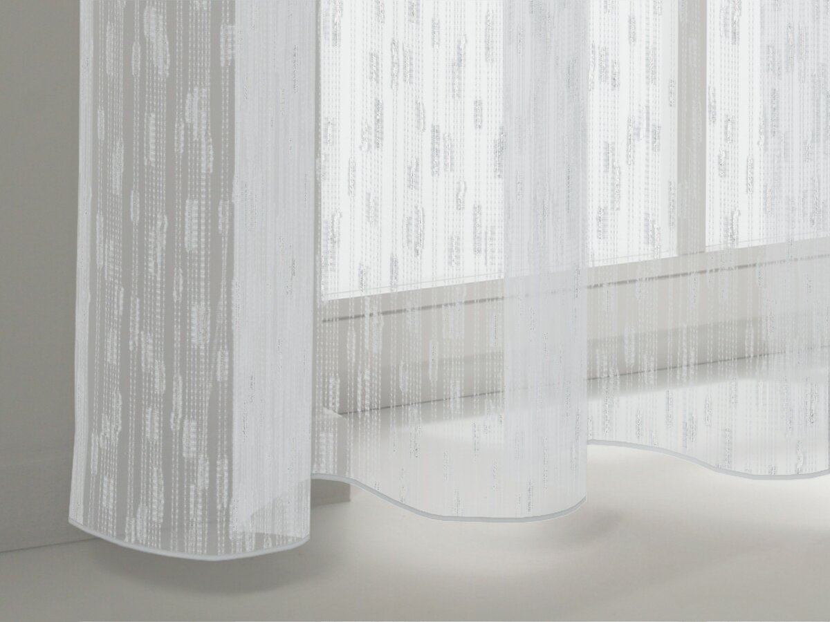 An glänzende Lichtreflexe auf sanfter Lagunendünung erinnert dieses Allover-Dessin, das sich wie eine Schraffur aus vielen kleinen Highlights über den transparenten Fond zieht – neben Weiß auch in aktuellen Messing- und Kupfertönen.