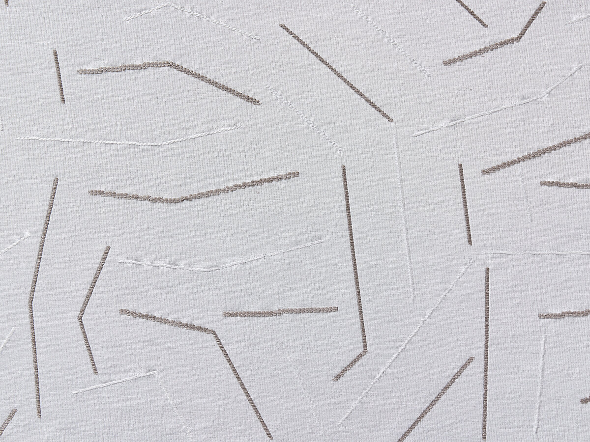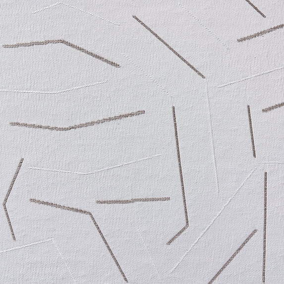 Die feinen Linienfragmente des geometrischen Jacquard-Designs setzen rhythmische Farbakzente auf der glatten, monochrom gehaltenen Stoffoberfläche.