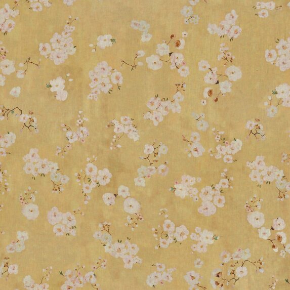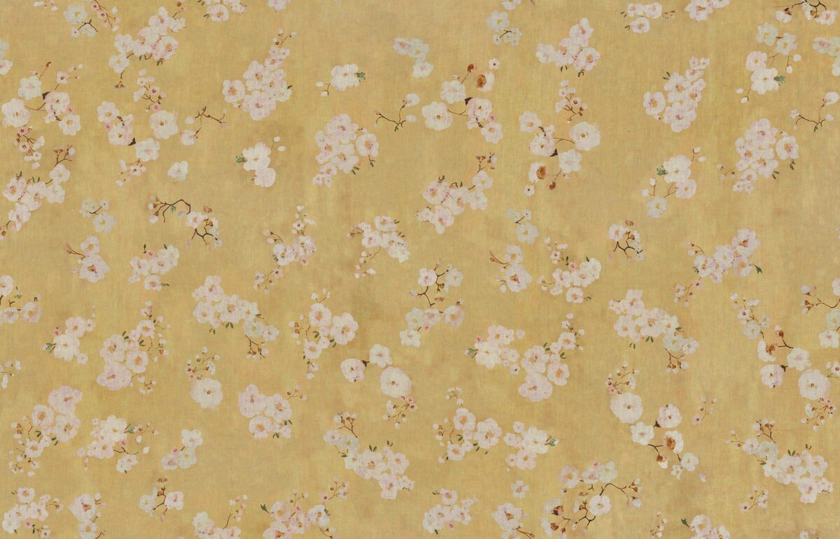 In digitalem Druck am Comer See auf einem langfaserigen 100% Leinen realisiert, tanzen die Blüten von Obstbäumen über einen farbigen Hintergrund. Die handgemalten Details sind von außergewöhnlicher Feinheit.