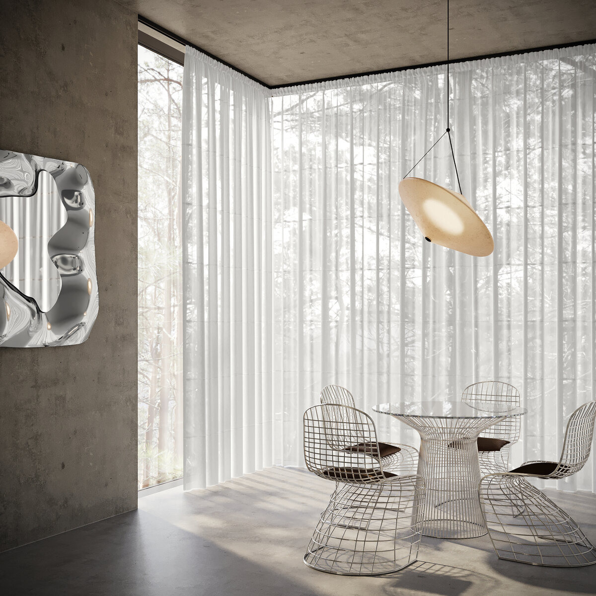 Gefertigt auf der hochwertigen Grundware 3045 RONDO, zeigt sich RIVER von seiner besten Seite: pflegeleicht, langlebig und mit wunderschönem Fall dank integriertem Beschwerungsband. In fünf natürlichen Nuancen – von Weiß über Taupe bis zu zartem Lachs – bringt RIVER Klarheit und Struktur in moderne Räume.