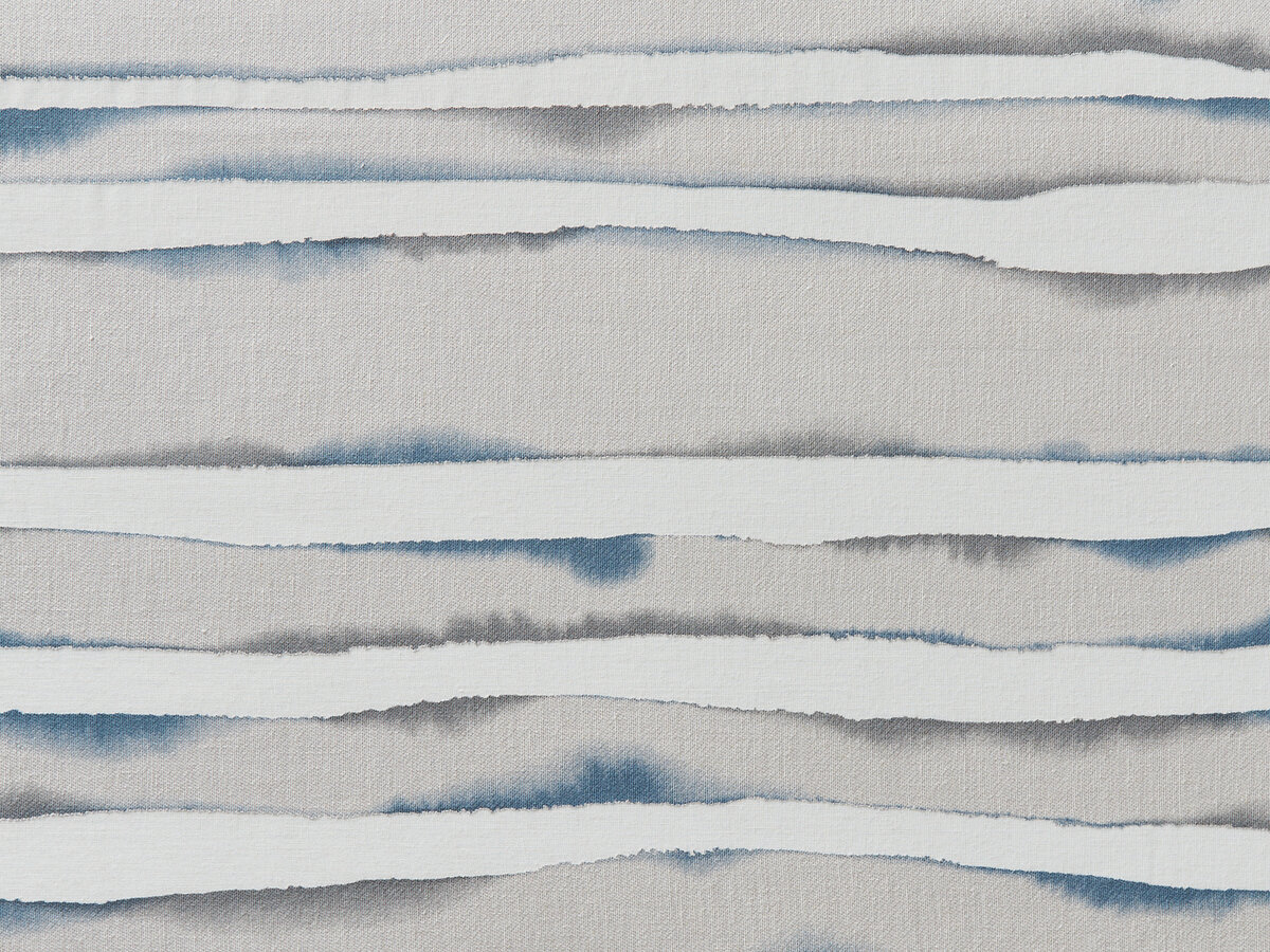 Feine Aquarell-Linien verlaufen in weichen Wellenbewegungen horizontal über diesen natürlich anmutenden Ausbrenner-Druck und zeichnen mit zarten Farbverläufen die abstrakte Andeutung einer weitläufigen Landschaft.