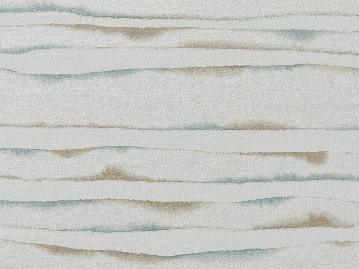 Feine Aquarell-Linien verlaufen in weichen Wellenbewegungen horizontal über diesen natürlich anmutenden Ausbrenner-Druck und zeichnen mit zarten Farbverläufen die abstrakte Andeutung einer weitläufigen Landschaft.