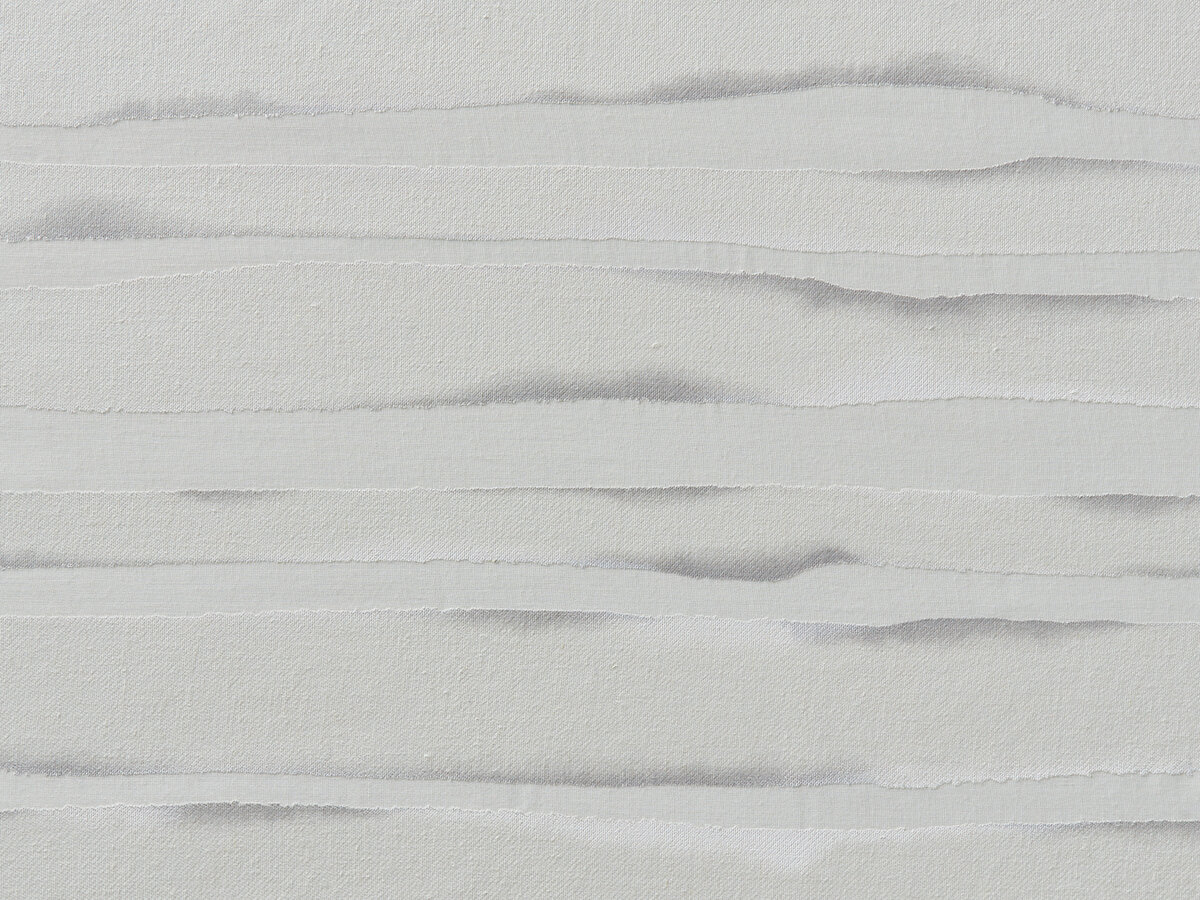 Feine Aquarell-Linien verlaufen in weichen Wellenbewegungen horizontal über diesen natürlich anmutenden Ausbrenner-Druck und zeichnen mit zarten Farbverläufen die abstrakte Andeutung einer weitläufigen Landschaft.