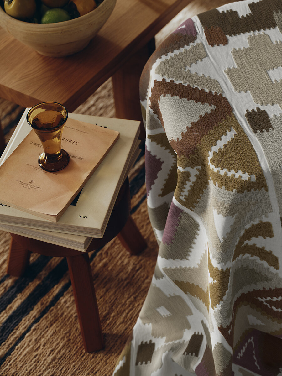 Die türkischen und kasachischen Kilim-Teppiche liefern die Inspiration für Solola. In Indien, im Einklang mit der Tradition und dem Know-how. Der Leinenstoff mit European Flax-Zertifikat wird von versierten Kunsthandwerkern von Hand mit wolligen Garnen bestickt. Die sonnigen Farben orientieren sich an den Webereien in Guatemala und anderen Ländern.