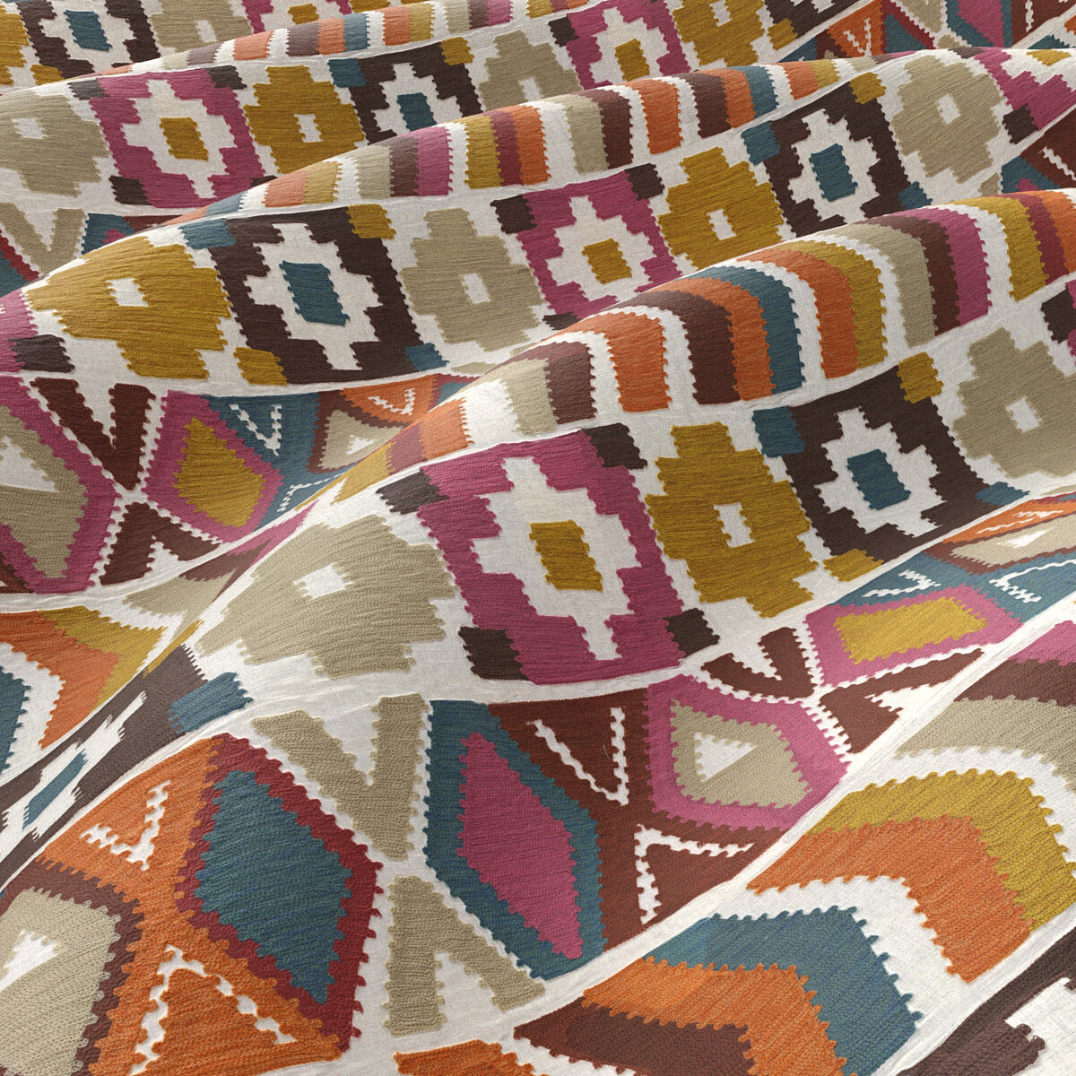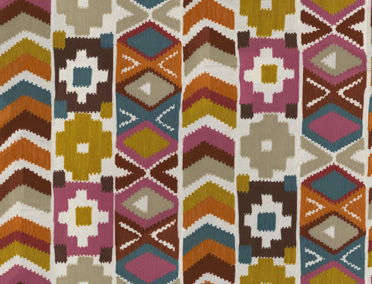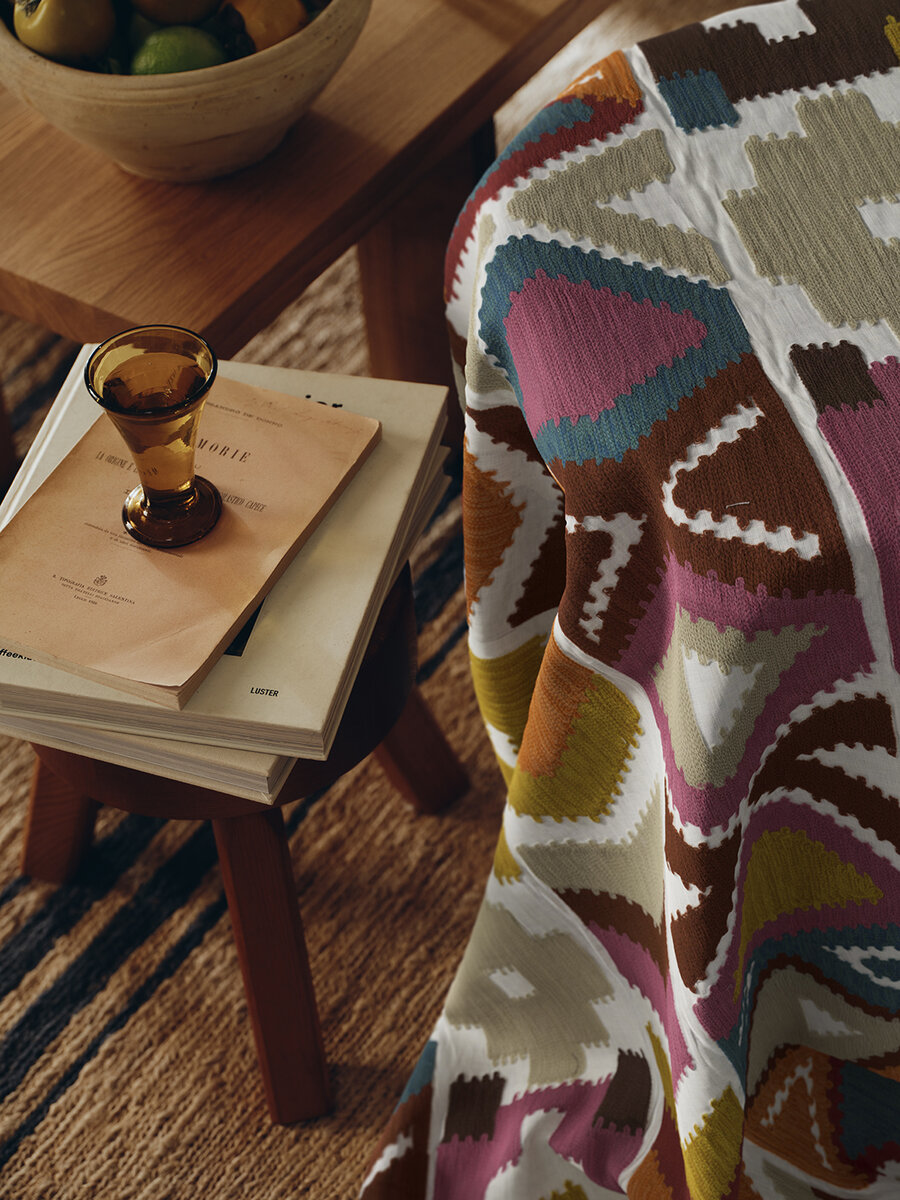 Die türkischen und kasachischen Kilim-Teppiche liefern die Inspiration für Solola. In Indien, im Einklang mit der Tradition und dem Know-how. Der Leinenstoff mit European Flax-Zertifikat wird von versierten Kunsthandwerkern von Hand mit wolligen Garnen bestickt. Die sonnigen Farben orientieren sich an den Webereien in Guatemala und anderen Ländern.